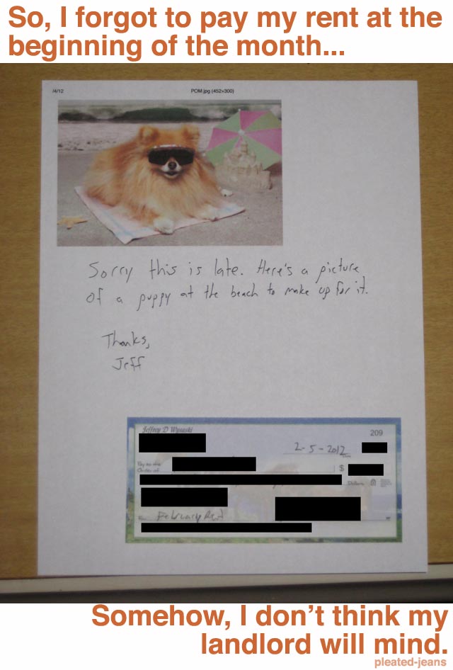 Originals So, I Forgot to Pay My Rent… ByJeff Wysaski February 7, 2012February 7, 2012 You may also like: Missing The Puppy Bowl Street Sign Changes to Google’s Privacy Policy