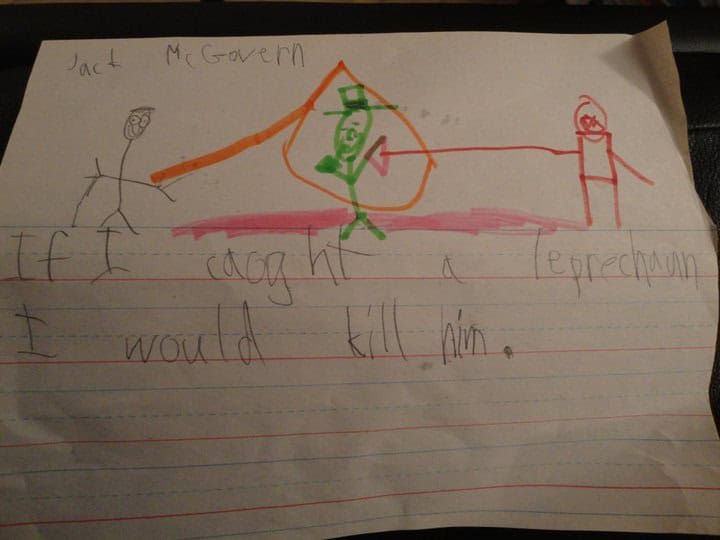 A proud parent (Michael) sent me this first pic. He says, “Last year my 6-year-old son was asked, ‘What would you do with a leprechaun if you caught him?’ This is what he drew. He’s holding the snare while a helper does the deed with a spear.”