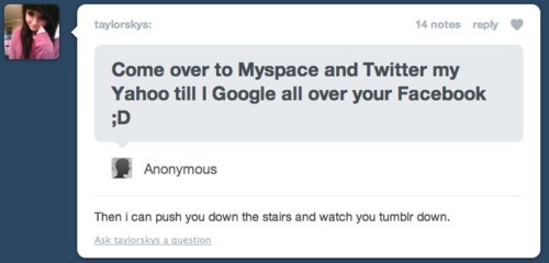Pic Dumps 15 Funny Comment Replies From People on Tumblr (4.3.12) Add as a preferred source on Google ByJeff Wysaski April 3, 2012April 3, 2012 Here’s a fresh round of snark from the world o’ tumblr… via via via via via via via via via via via via via via via Previously: 18 More Funny Comment Replies From People on Tumblr 16 Funny Tumblr Coincidences <–Back to Home Page
