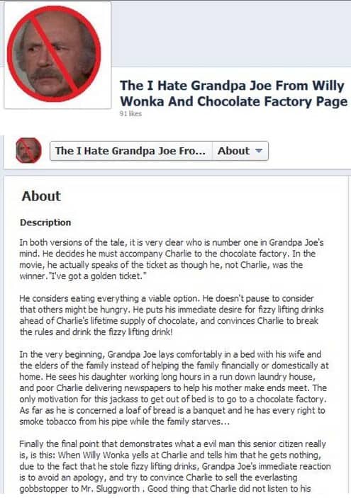 Images Why You Should Hate Grandpa Joe From Willy Wonka and the Chocolate Factory Add as a preferred source on Google ByJeff Wysaski May 16, 2012May 16, 2012 On the surface, Grandpa Joe seems like a sweet old man, but below is a pretty rock-solid argument for why you should hate him… via