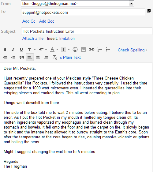 Images Hot Pocket Instructions Email ByJeff Wysaski July 3, 2012July 3, 2012 My friend The Frogman recently sent some feedback to Hot Pockets. I think he speaks on behalf of a lot of us…
