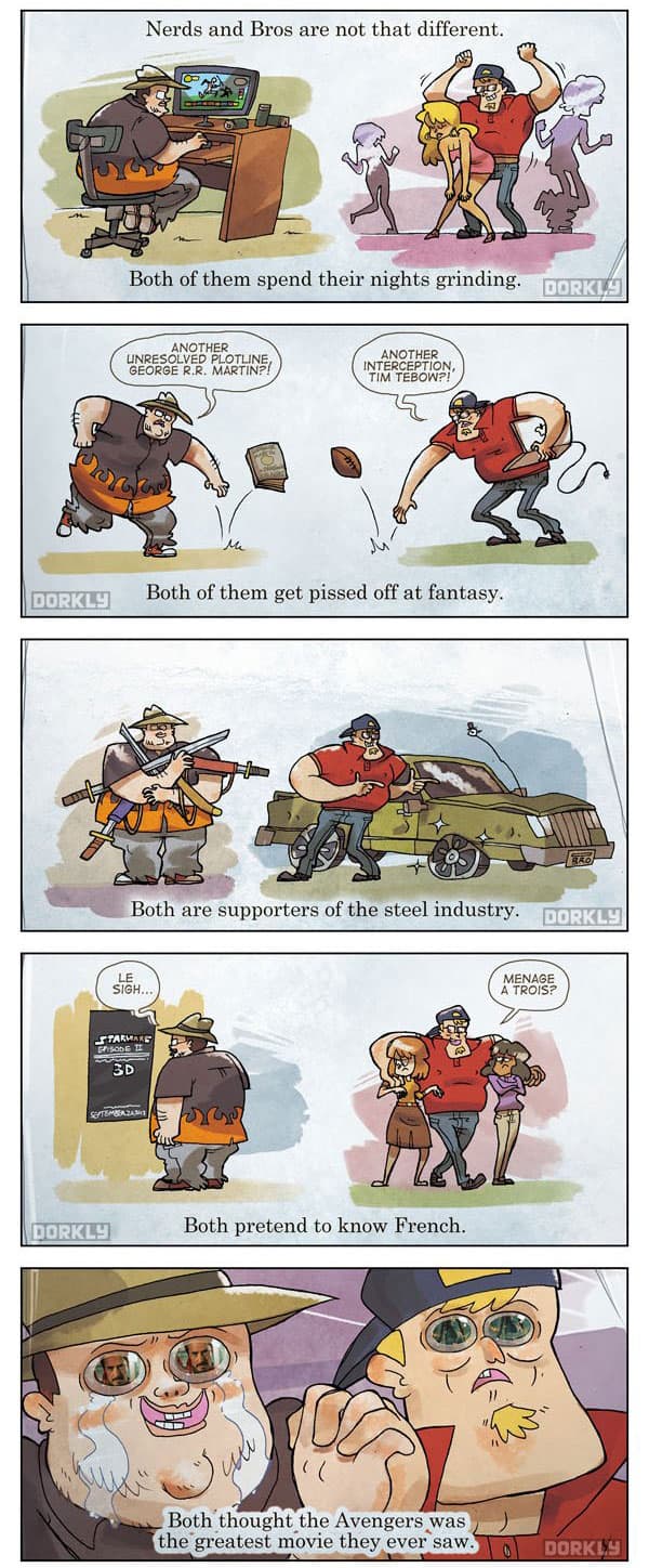 The folks over at Dorkly show us that nerds and bros are actually far more similar than most people think. Click through for the full thingy. [via insanely gaming]
