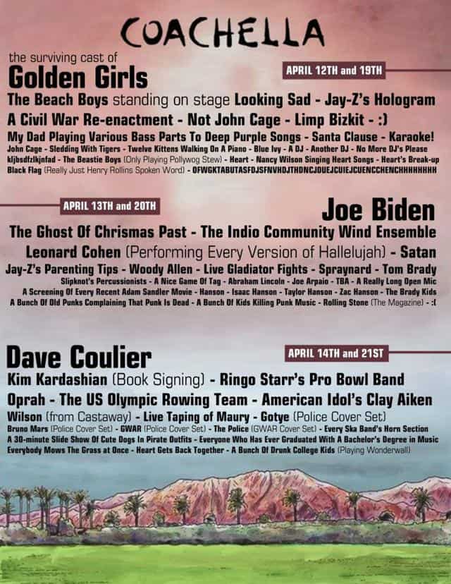 Images The Coachella 2013 Lineup Add as a preferred source on Google ByJeff Wysaski January 25, 2013January 26, 2013 Here’s your (totally not real) lineup for this year’s Coachella Music Festival… sleddingwithtigers | via
