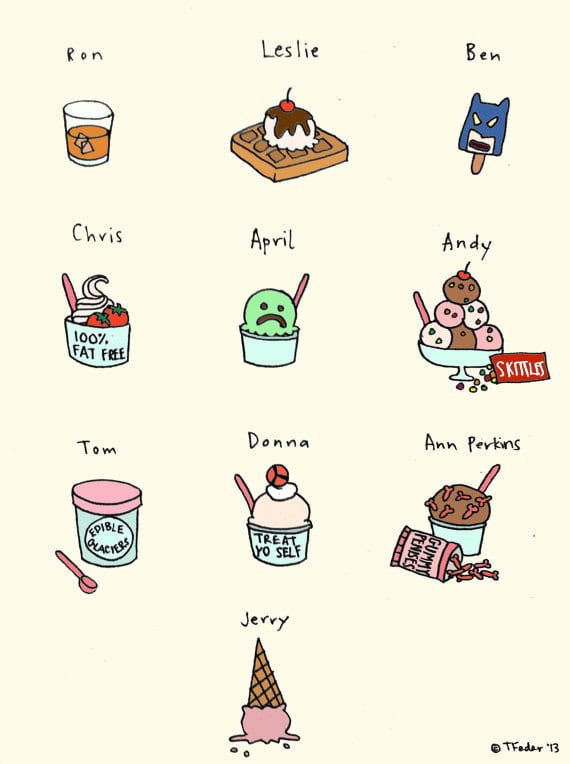Artist Tyler Feder translates the characters of Parks and Rec into applicable types of ice cream. Print available here.