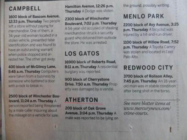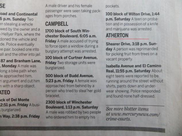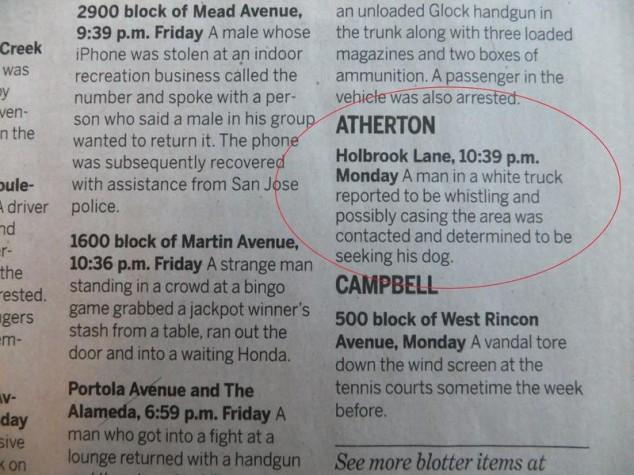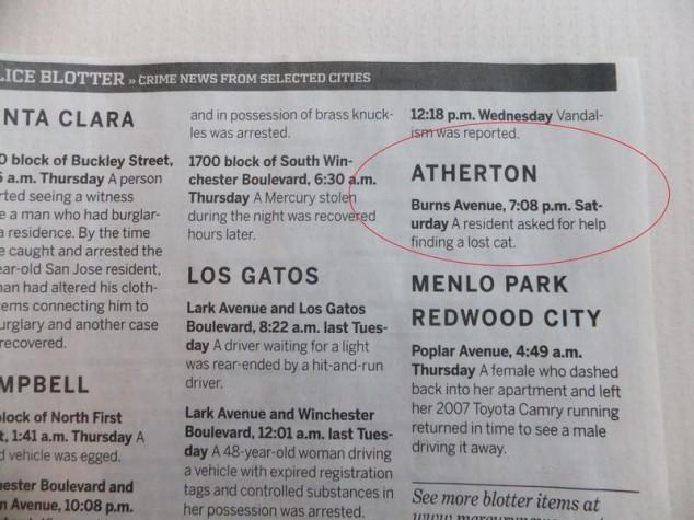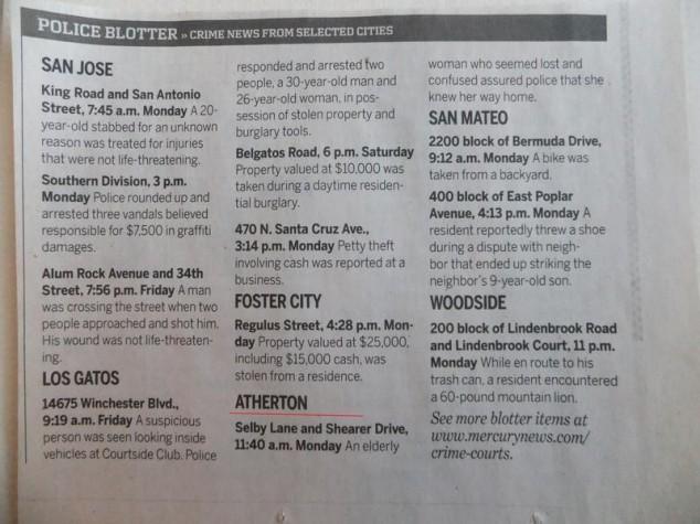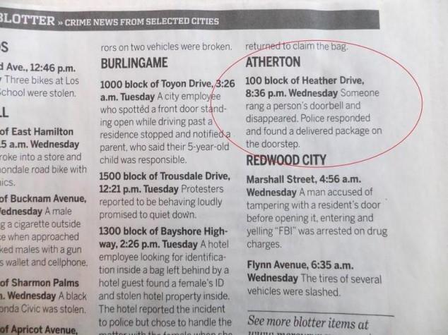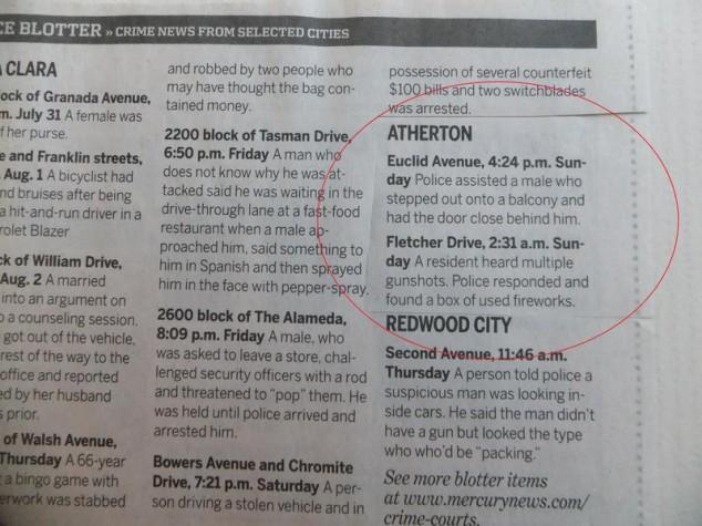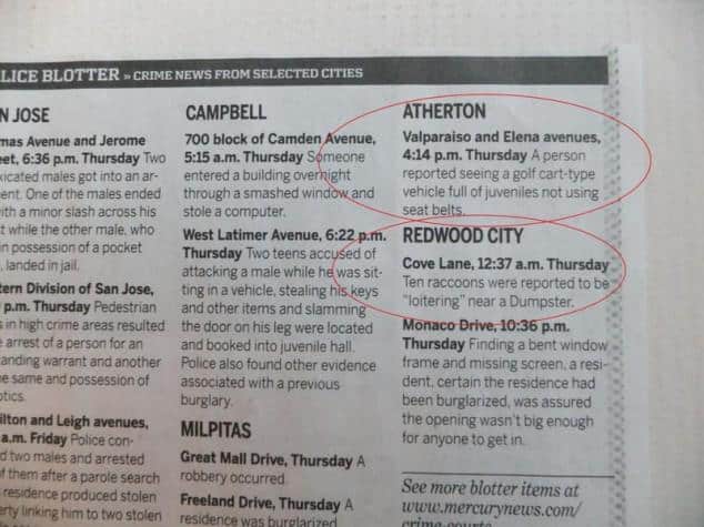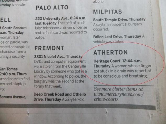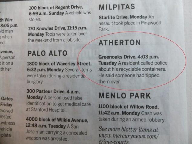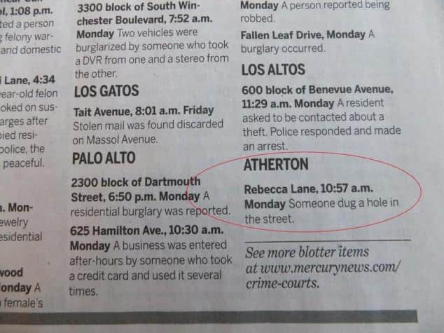Atherton, California is the third most expensive zip code in the United States. With all that money, crime isn’t too big of an issue. Here are some emergencies the local police have had to deal with recently. [via gawker]