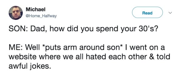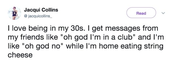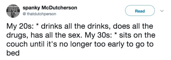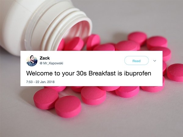 Time comes for us all, these tweets prove that, and while 30 is still considered young, it sure doesn’t feel anywhere like 20. Youth is wasted on the young and you don’t appreciate what you have until it’s gone, but it’s all about making the change as gracefully as possible. Transitioning from your 20s to your 30s means making some crucial adjustments. Adjustments like making a some kind of noise when you stand up, consistently choosing comfort over style, and accepting that a hangover now means losing a whole day.