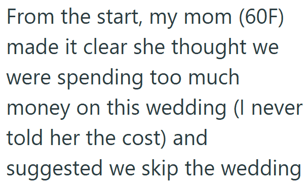 But the bride’s mother, who was vocal from the start about thinking a big wedding was a waste of money, threw everyone for a loop.