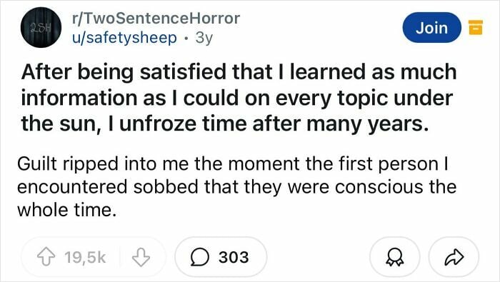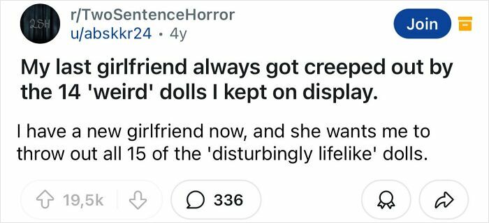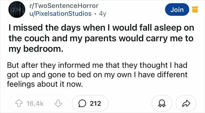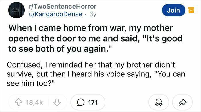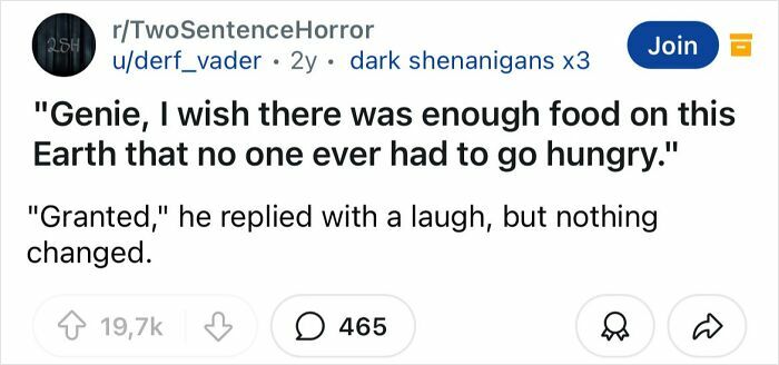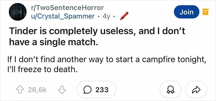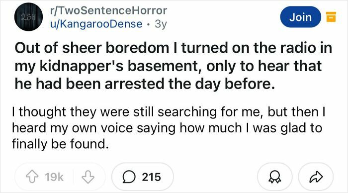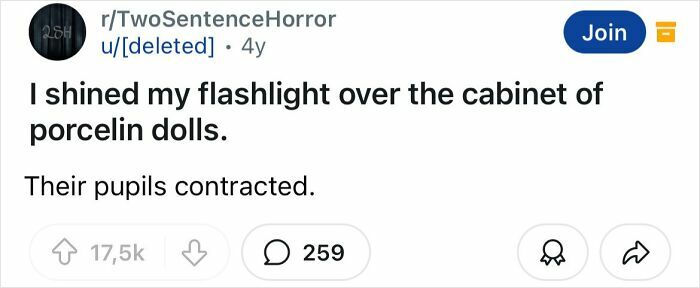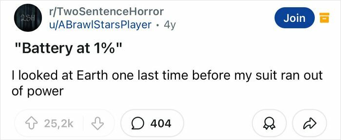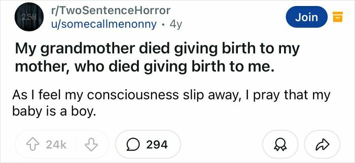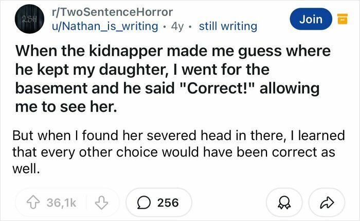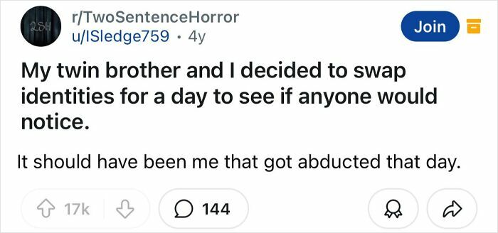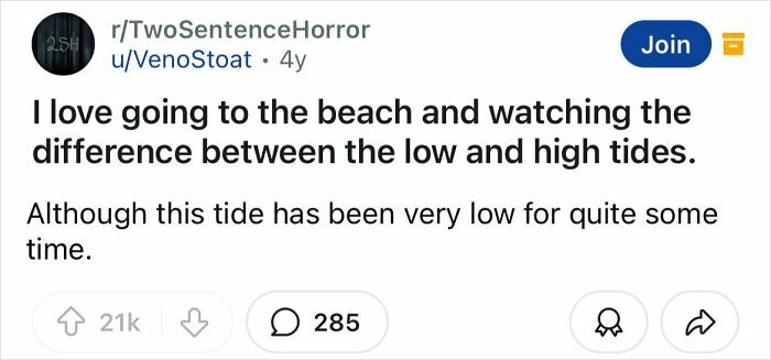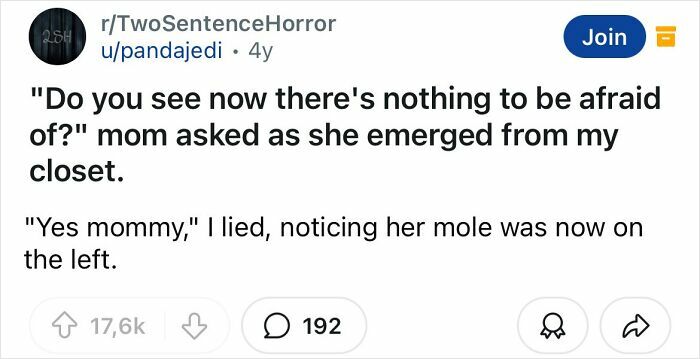 Some of what makes a good horror story is really being able to set the mood and develop the story and characters. That’s what makes these two sentence horror stories so good.