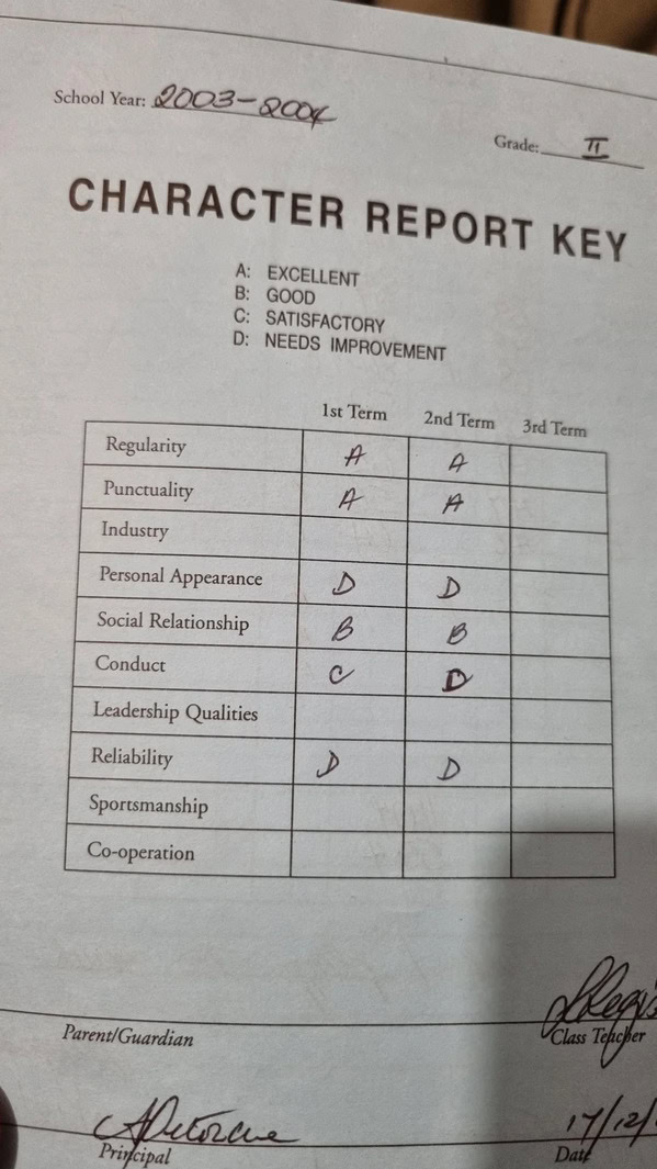 28. “My cousin’s old report card from primary school rated personal appearance”