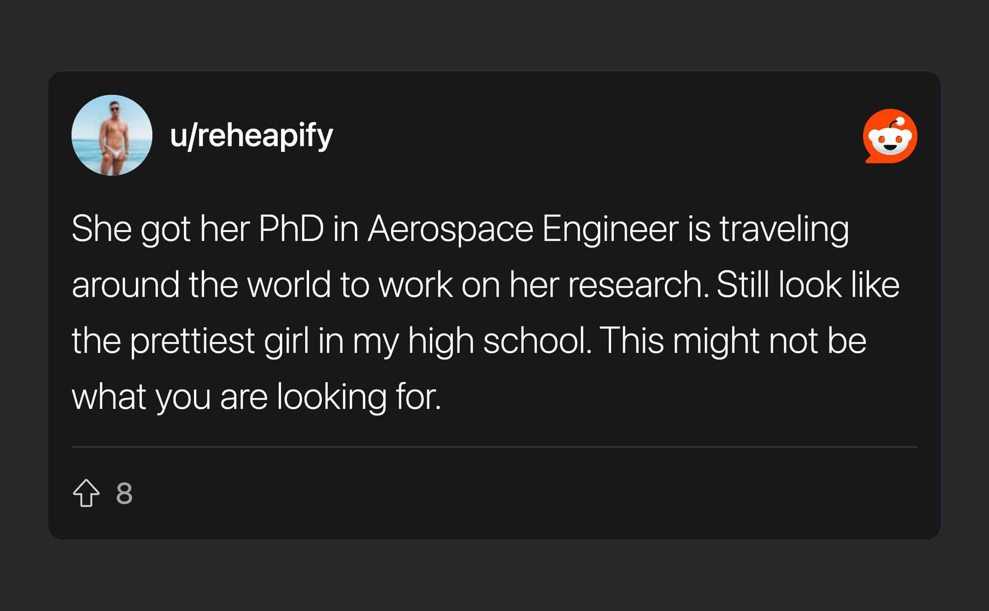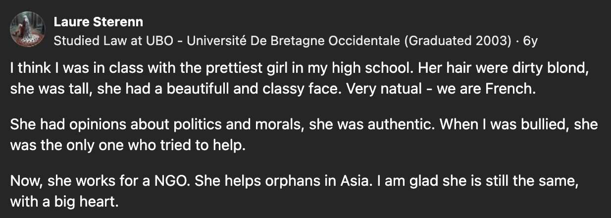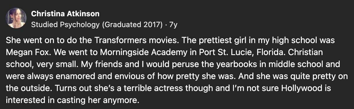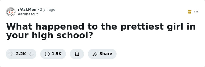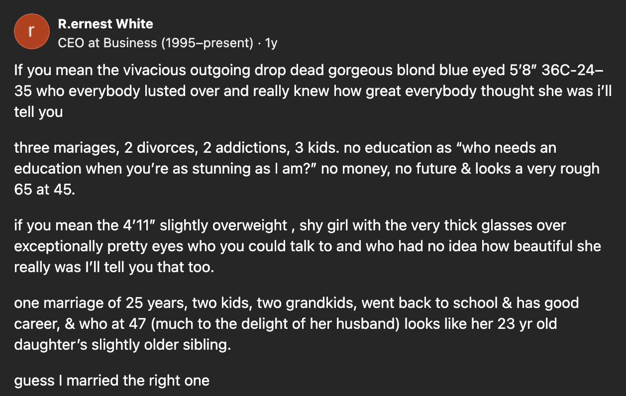 I honestly have no clue what happened to the prettiest girl in my high school. I didn’t really keep touch with anyone from back then. The people in this post, however, all have a story about what happened to the girls from their HS.