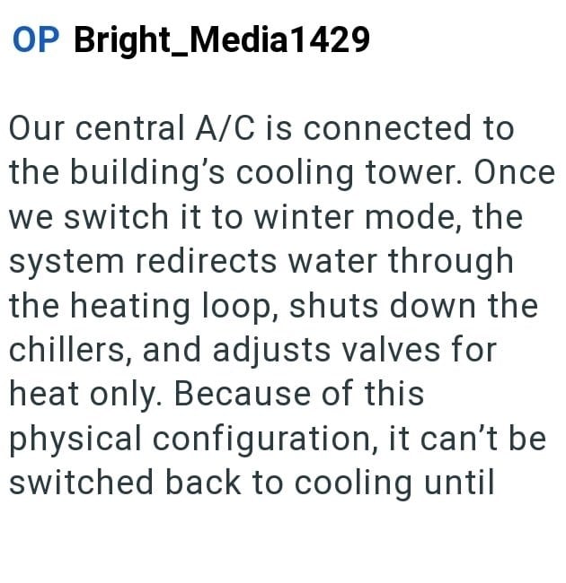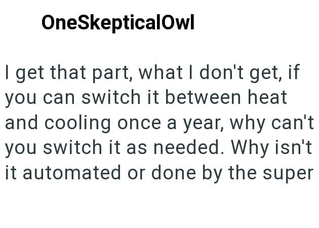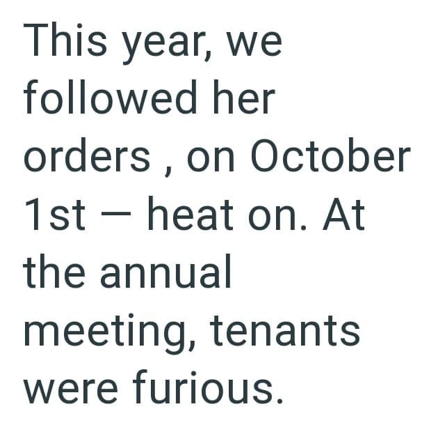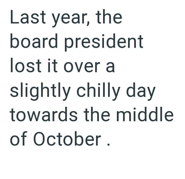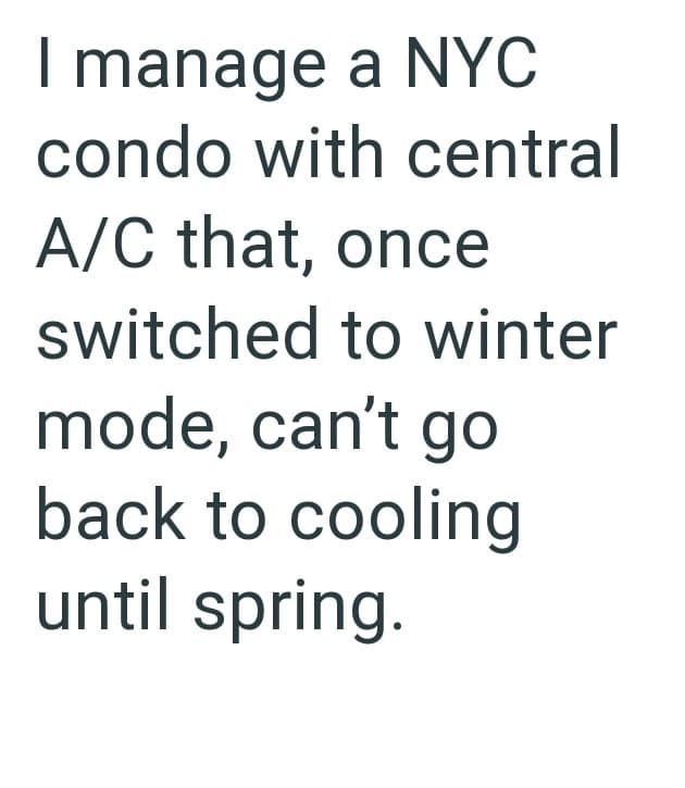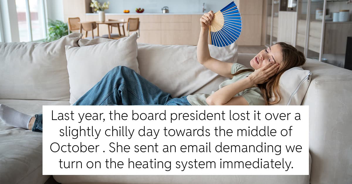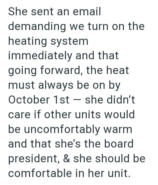 In this Reddit post one condo manager is dealing with an egotistical HOA president who is demanding that heating be turned on for all units even though the weather is still unseasonably warm.