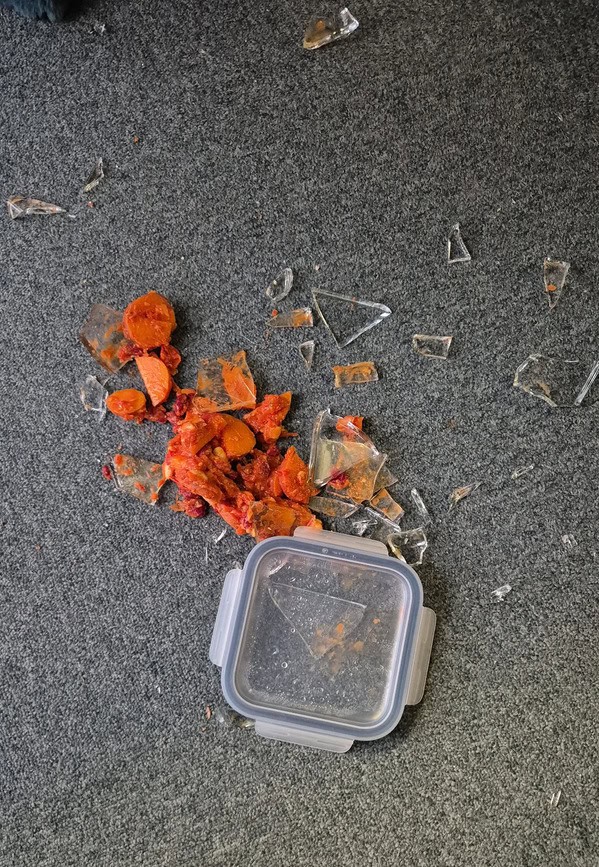 Lunchtime rolls around, I grab my bag, head over to the microwave and found shattered glass all in my steak y arroz y habichuelas.