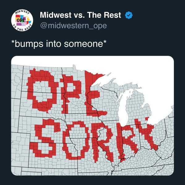 I drop an “ope” almost daily without even realizing it. Anytime I leave the Midwest, people clock it immediately like I’m carrying a regional accent in my pocket. Honestly, there are worse quirks to have, and it’s definitely earned us our very own category of memes.