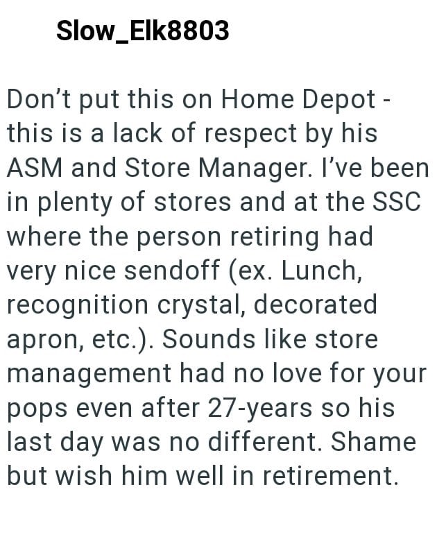 In this Reddit post a son shares the story of his dad retiring from a 27 year career at Home Depot only to find that his only retirement gift from management is a Snickers bar and a small pack of Oreos.