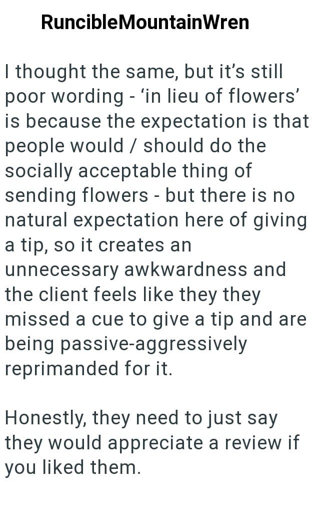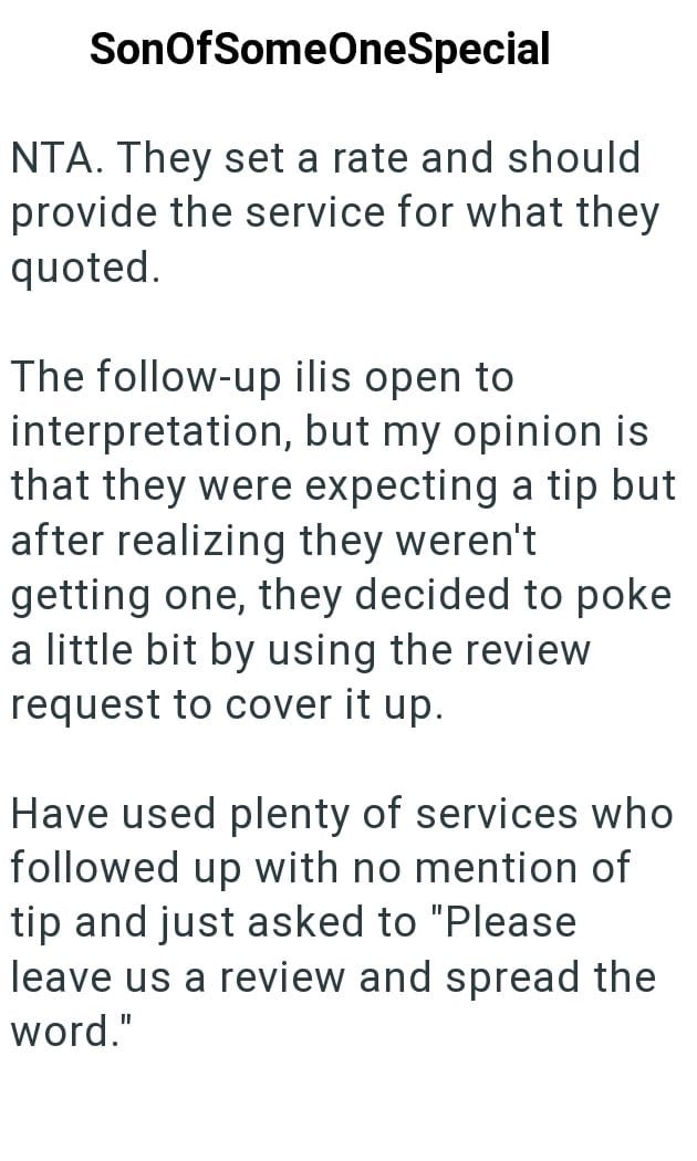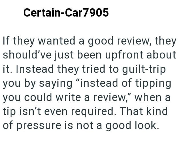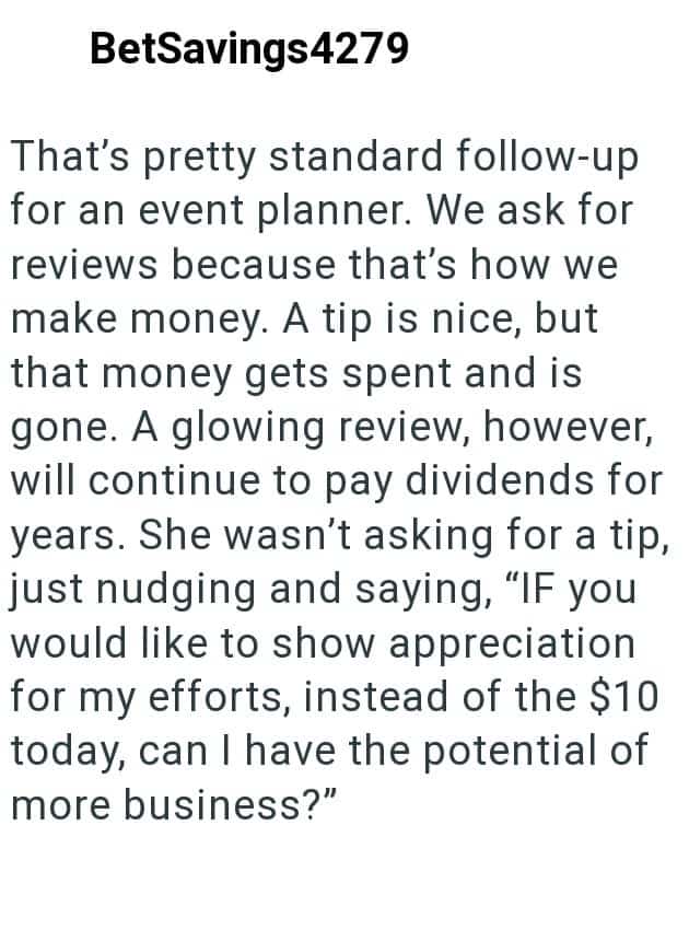 Well, once the job was done the event planner strongly hinted that he should’ve tipped, but asked for a good reviews since he wouldn’t be getting one. Now the client is wondering if he did the right thing.