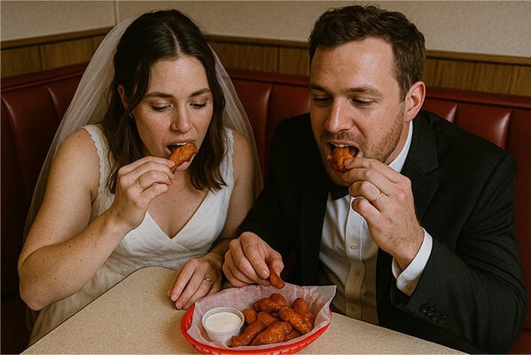 Five or six months later, they come in in full wedding garb. I assume they’re coming for an afterparty of some sort, but nope, a JP walks in behind them. They said their vows in “their” booth and finished it off with two large orders of wings and some fried pickles.