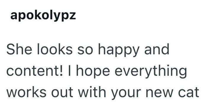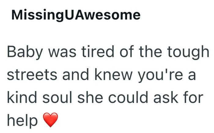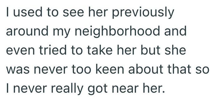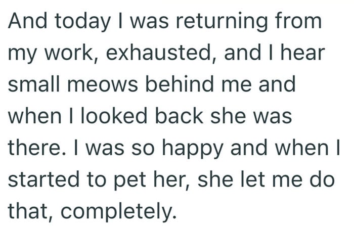 This person had been seeing a stray cat around their neighborhood for months. She always kept her distance. Then one day, after an exhausting shift at work, everything changed. The cat made her choice, and now she has a new home.