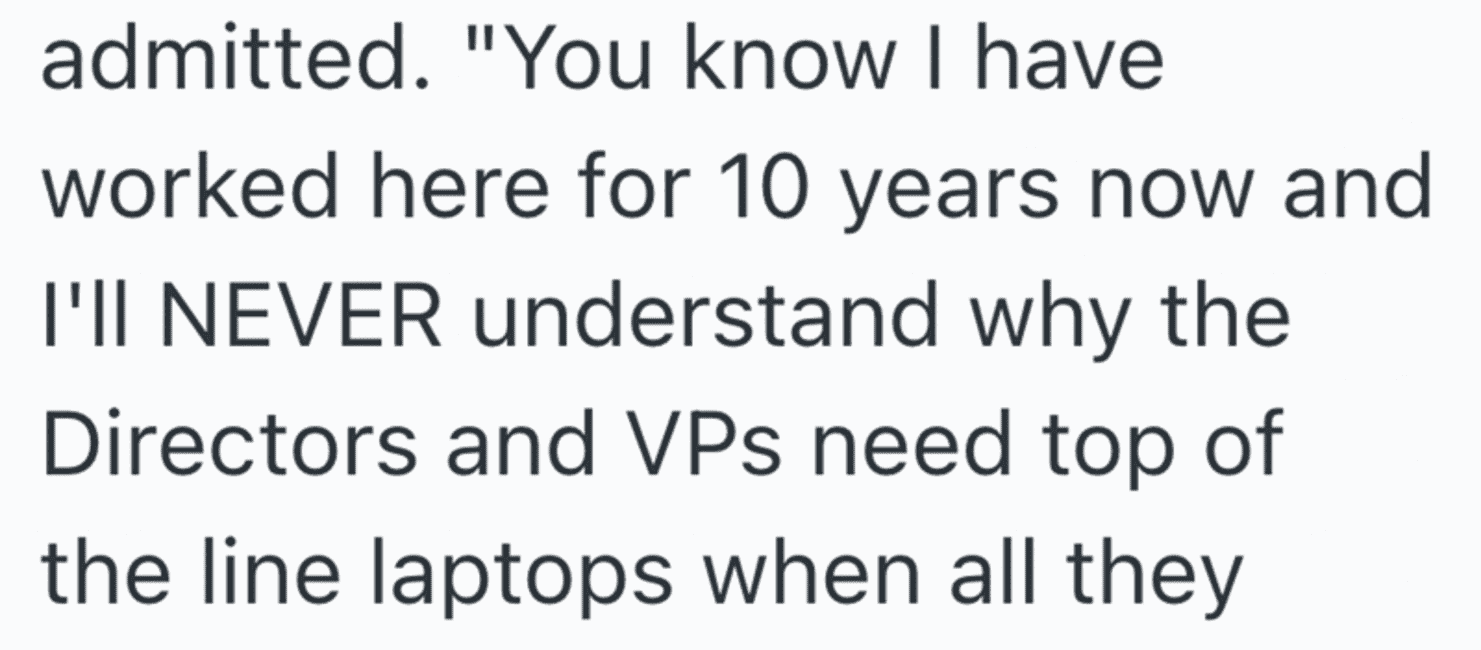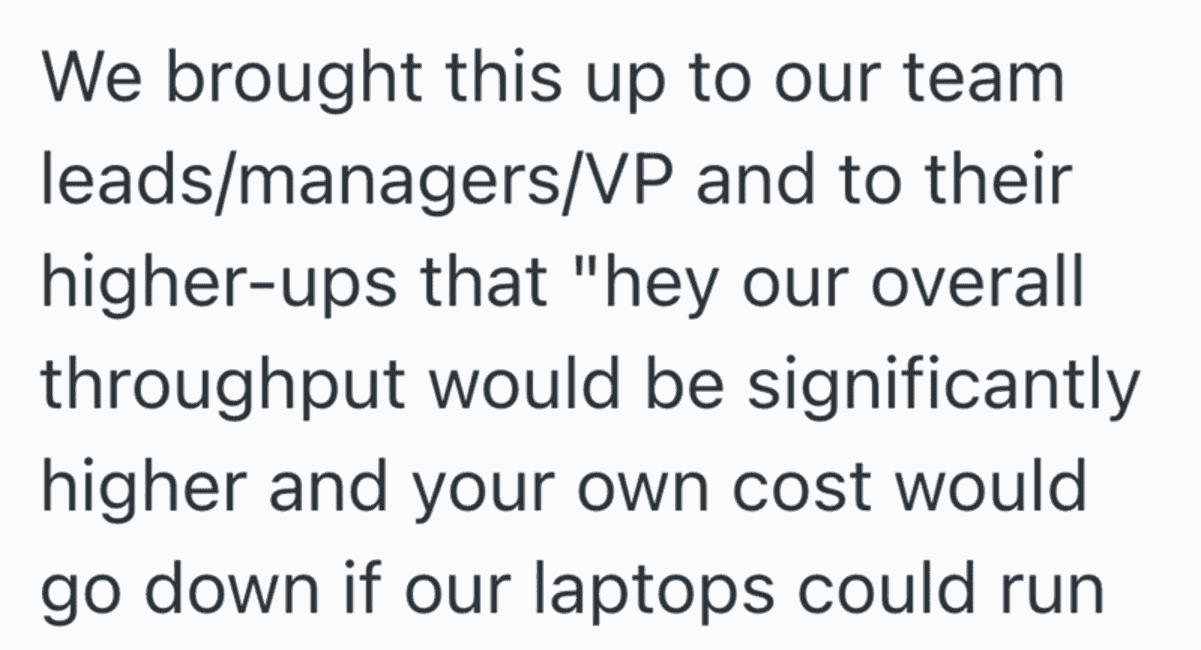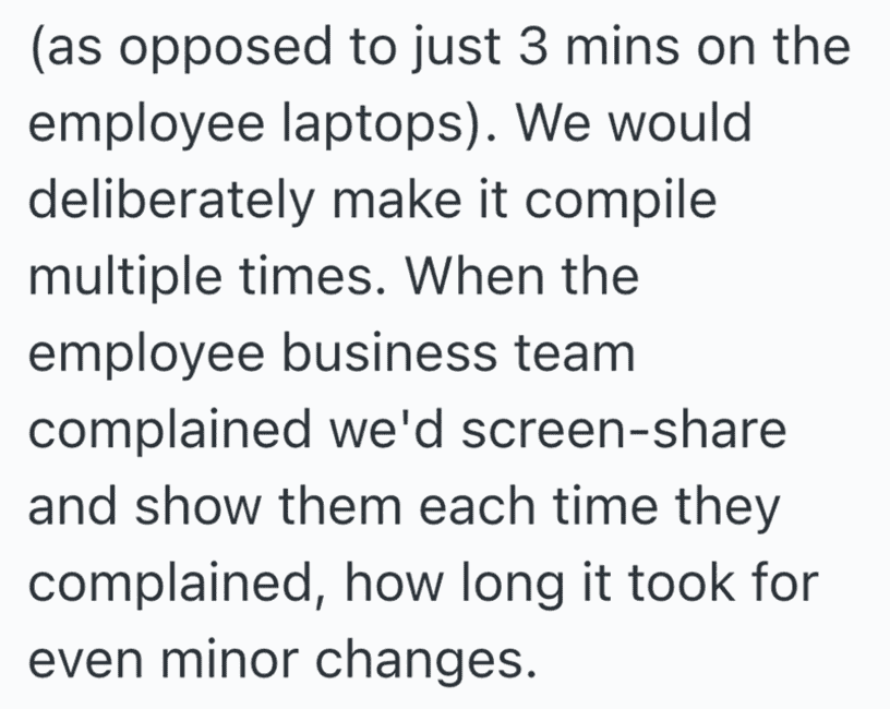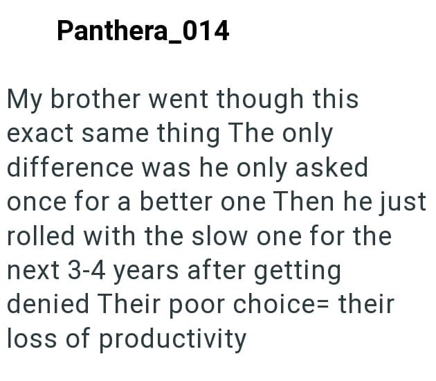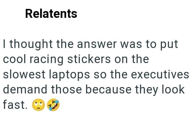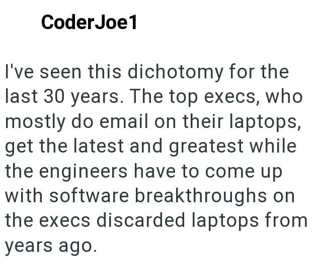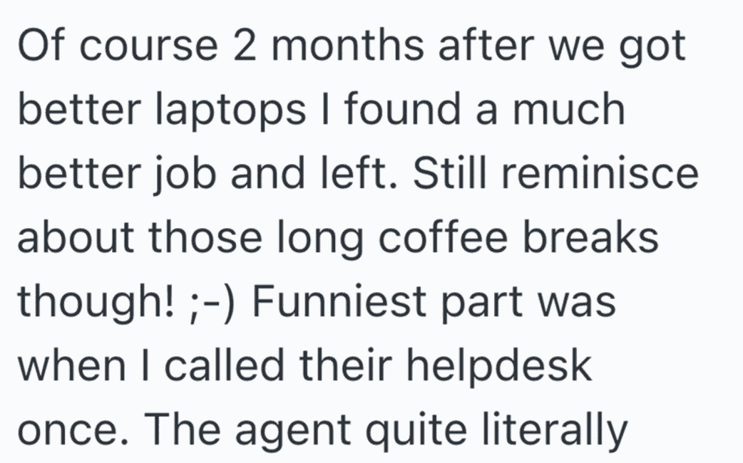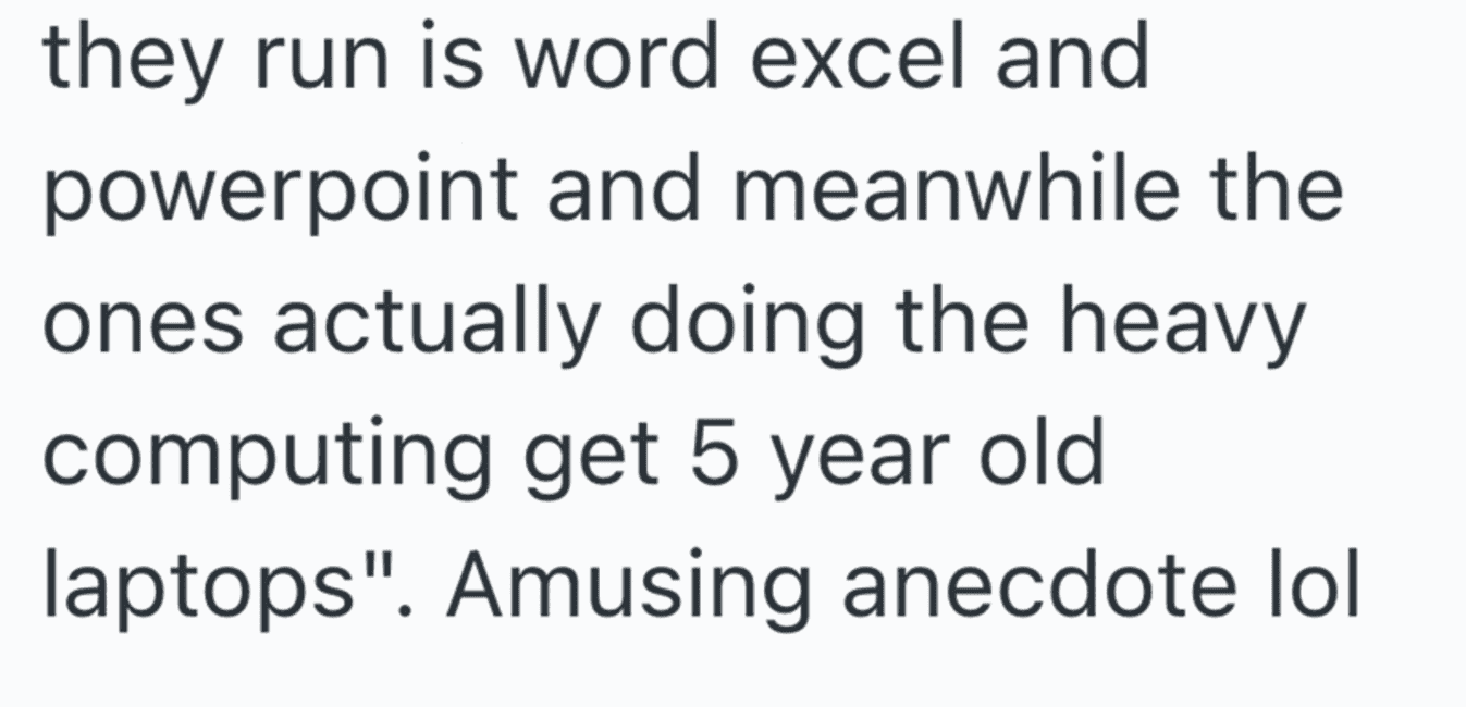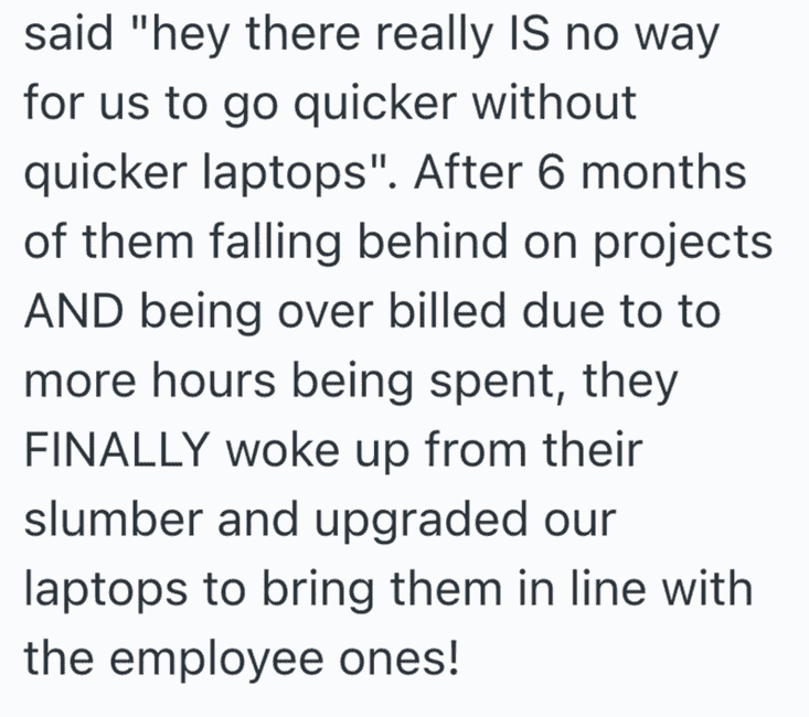 In an act of malicious compliance these employees purposefully worked at a snail’s pace since the higher ups didn’t want to give them better laptops. You get what you pay for, after all.