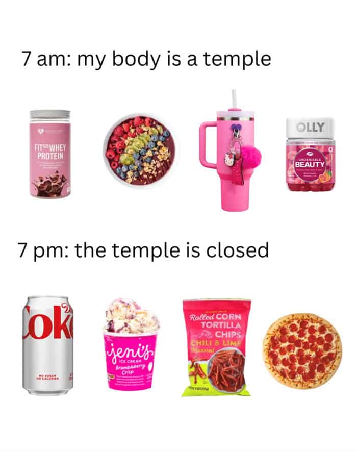 These memes are for people in that same space. Eating-positive memes that reject diet culture’s January takeover. Food is good. Eating is normal. You don’t need to restrict yourself because the year changed. That’s the whole message.