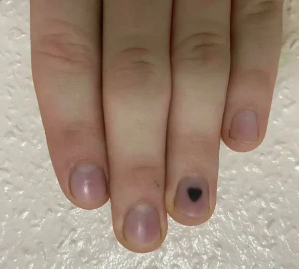 14. A blood blister shaped like a heart.