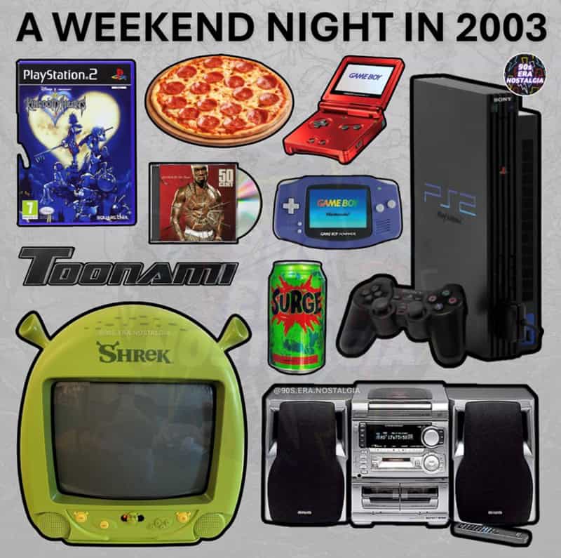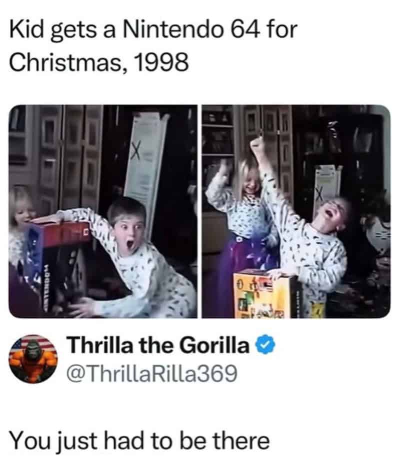 Just looking at old N64 controllers and brick Nokia phones and whatever else we thought was cool back then. No deeper meaning, no lesson—just remembering when the internet came through a phone line and you had to rewind movies before returning them.
