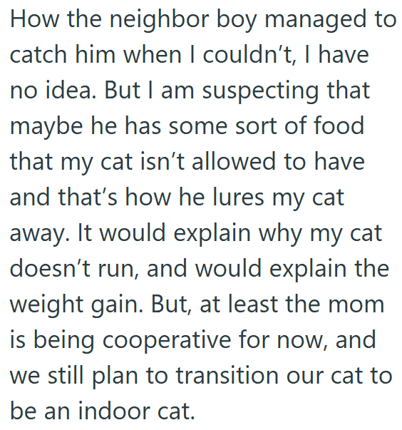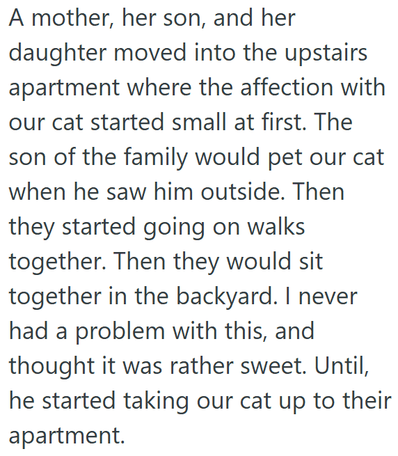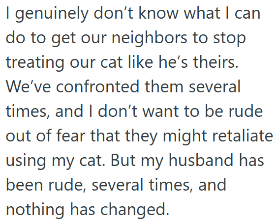 That’s the position this cat owner found themselves in. They’re asking for advice in this Reddit post on what to do about a new neighbor who keeps taking their cat.