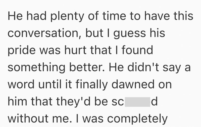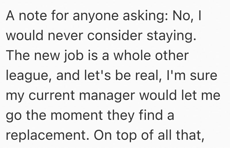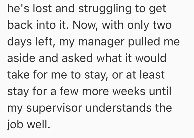In this Reddit post, one employee gave his notice at his job and now his shady manager is begging him to stay on until they get someone new trained to take over.