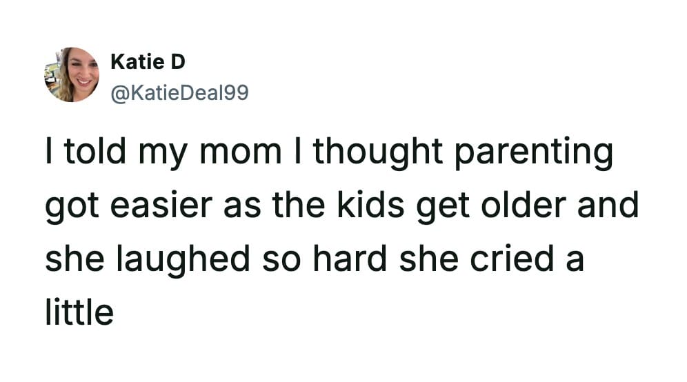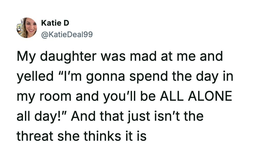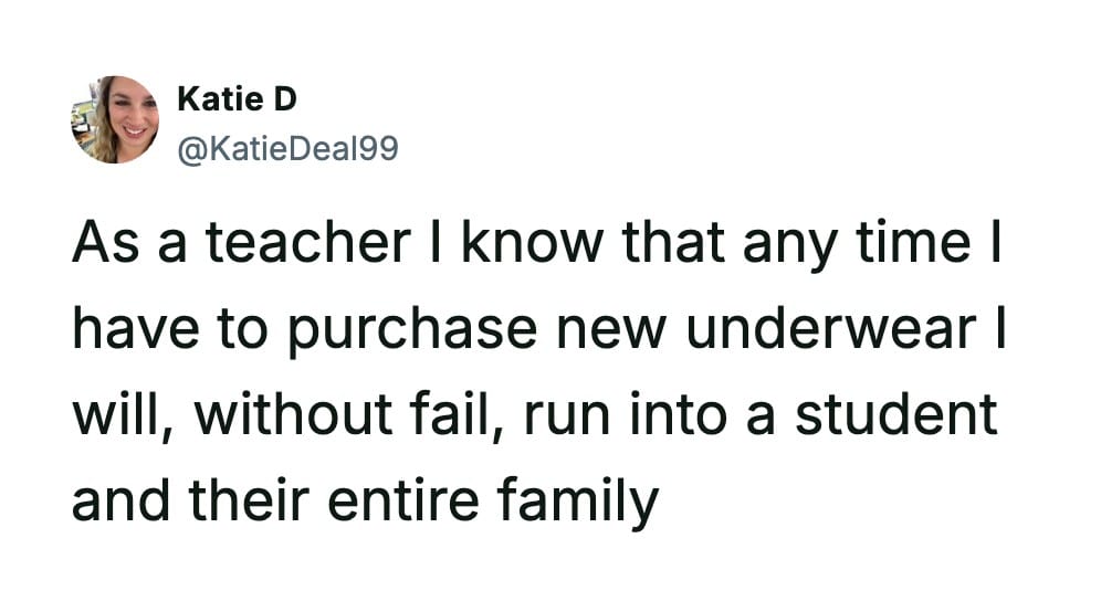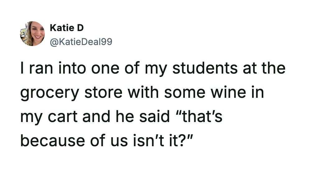 I’m pretty sure being both a parent and a teacher qualifies as a legal form of psychological warfare, and I honestly don’t know how Katie D still has the cognitive function to form sentences.