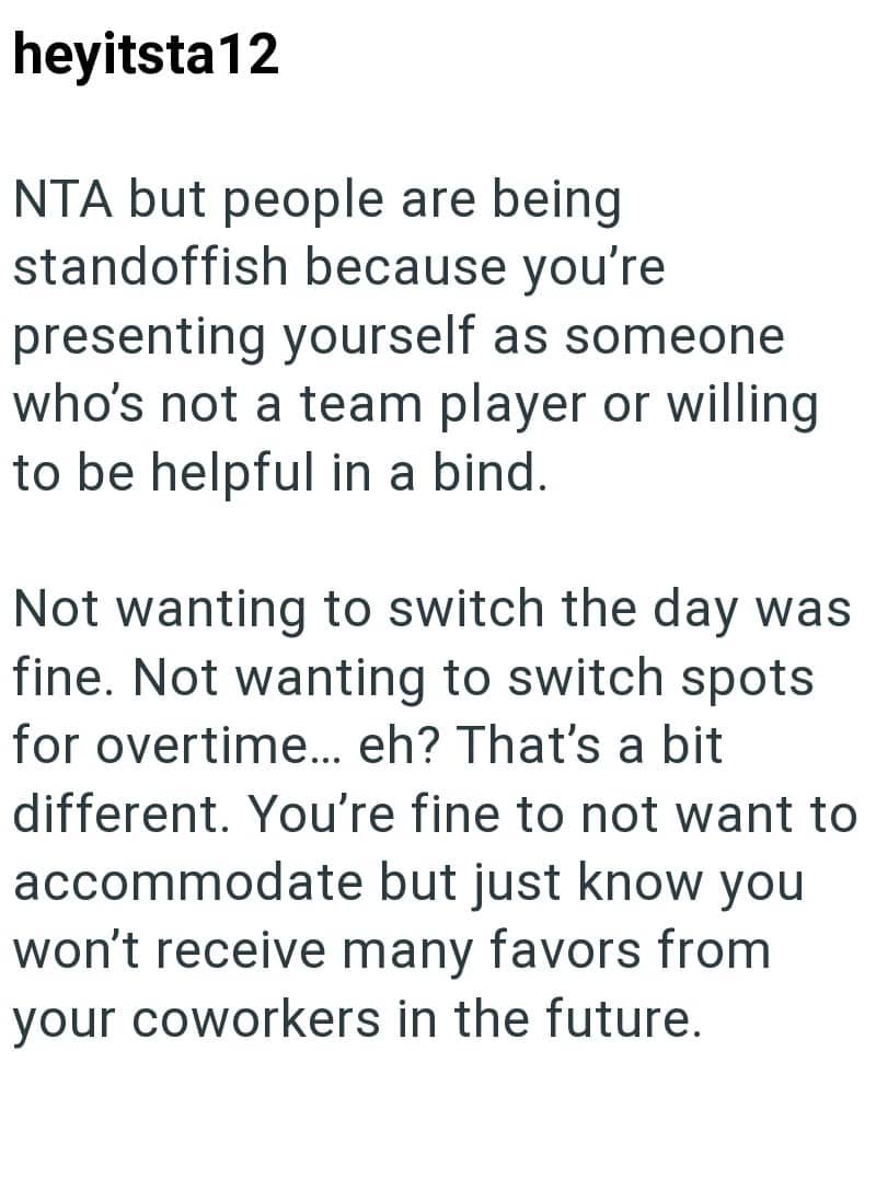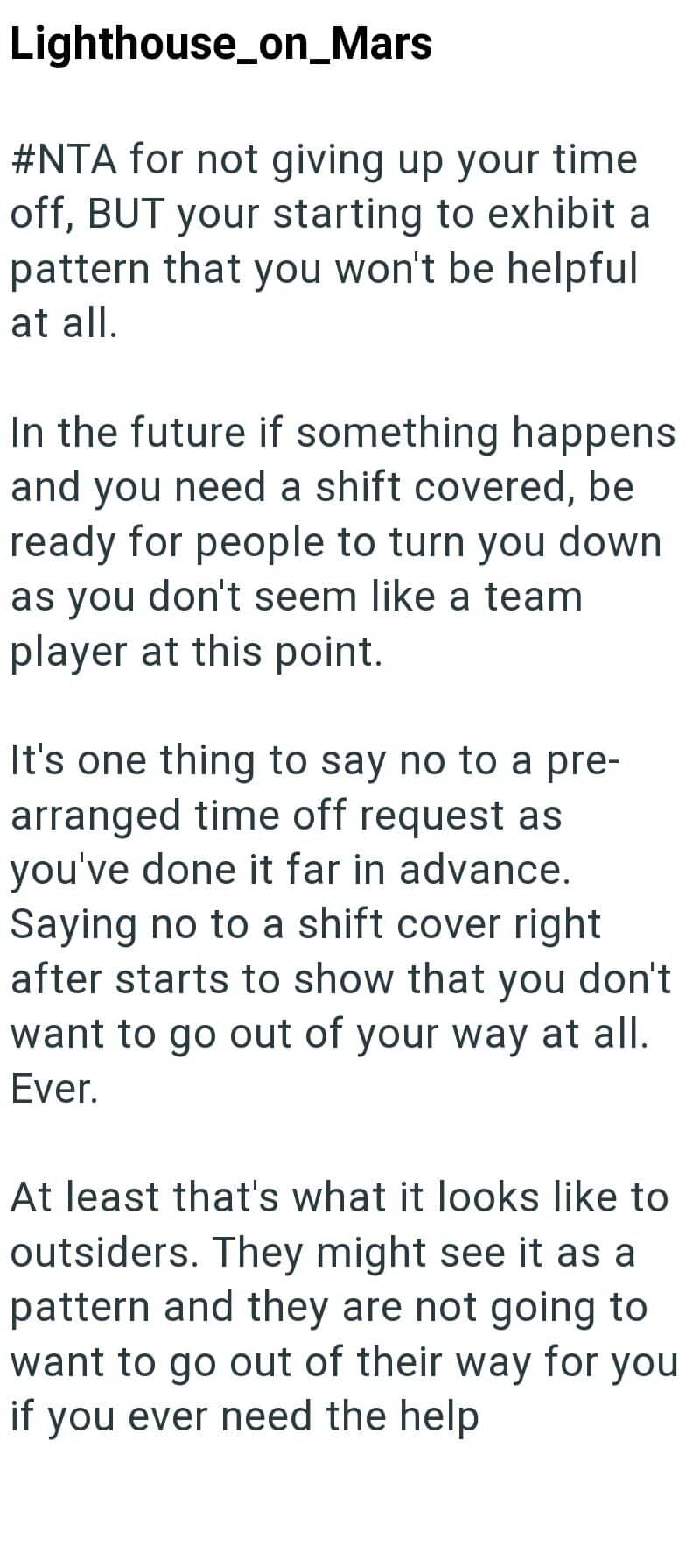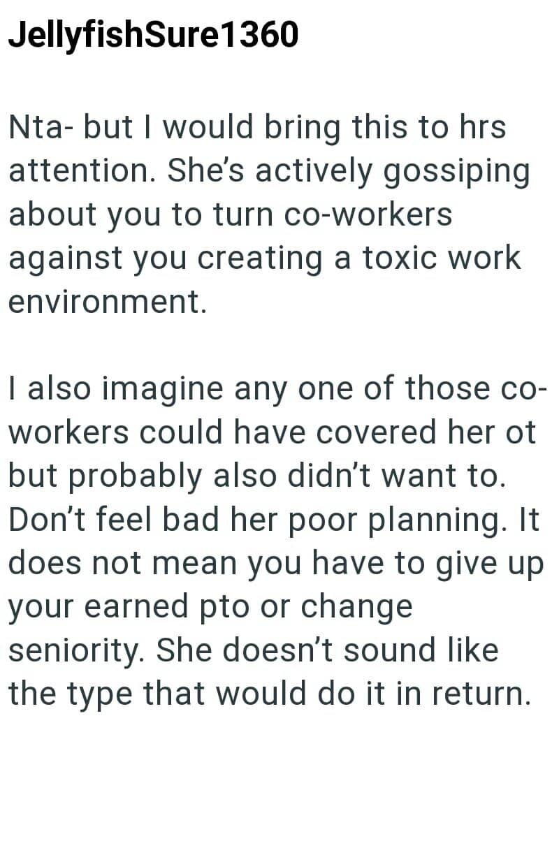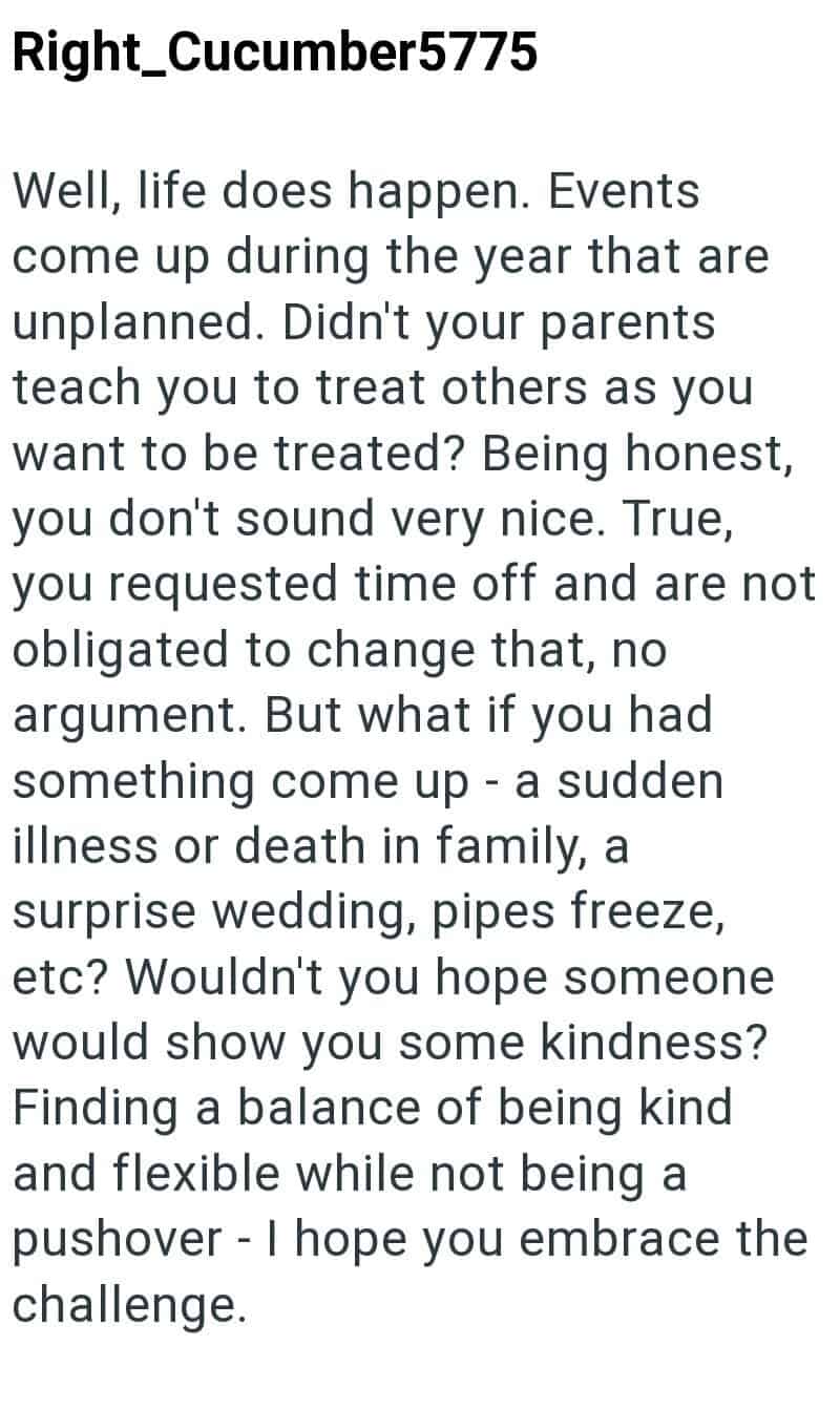 Now that coworker is receiving backlash for not wanting to give up her vacation, even though she’s 100% in the right to deny it.