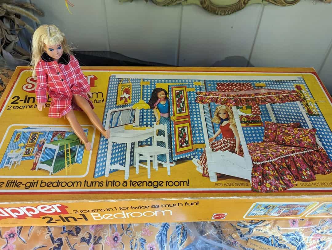 “Skipper has a little Weird Barbie energy- black pen or marker on the face- how should I wash her? I can’t believe all the parts are there even the instructions. The pattern on the bedspread is fantastic, I wish I had it on mine! It doesn’t even look like it was ever assembled!”