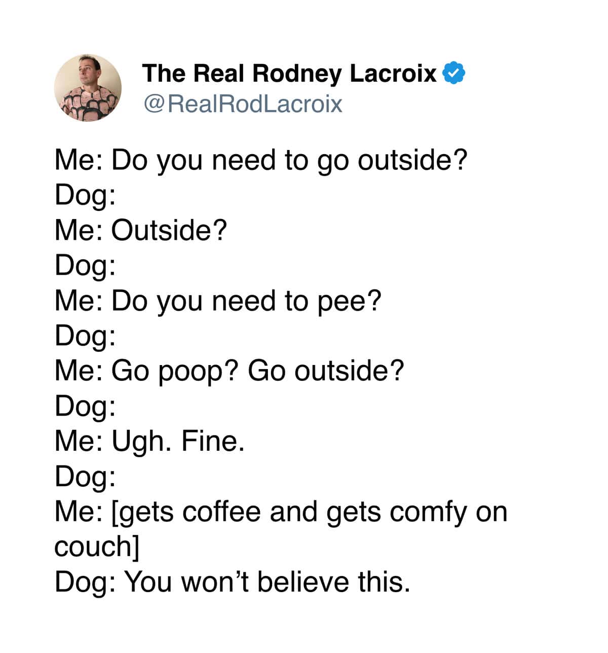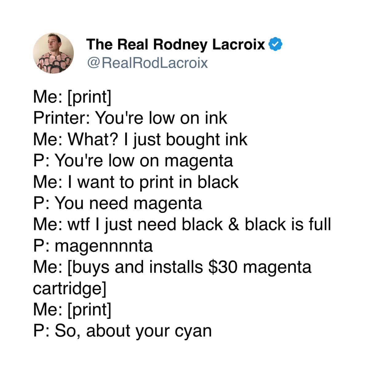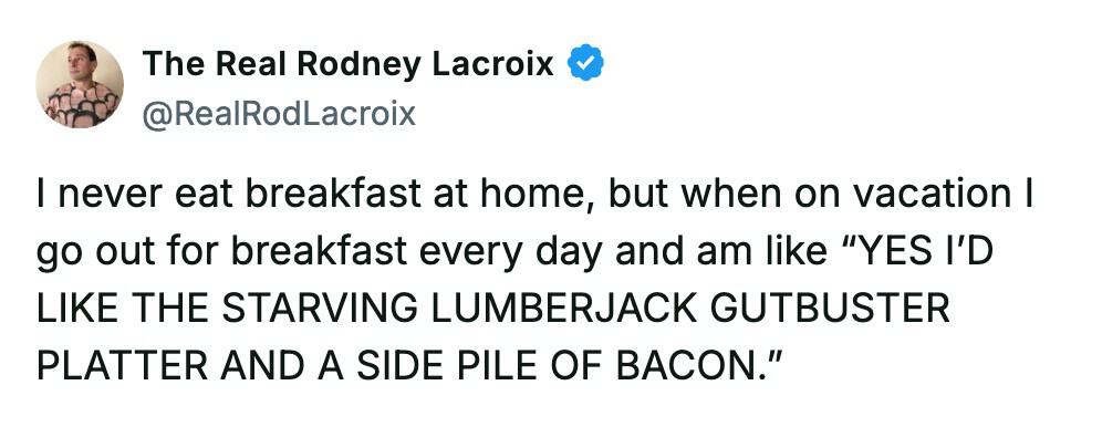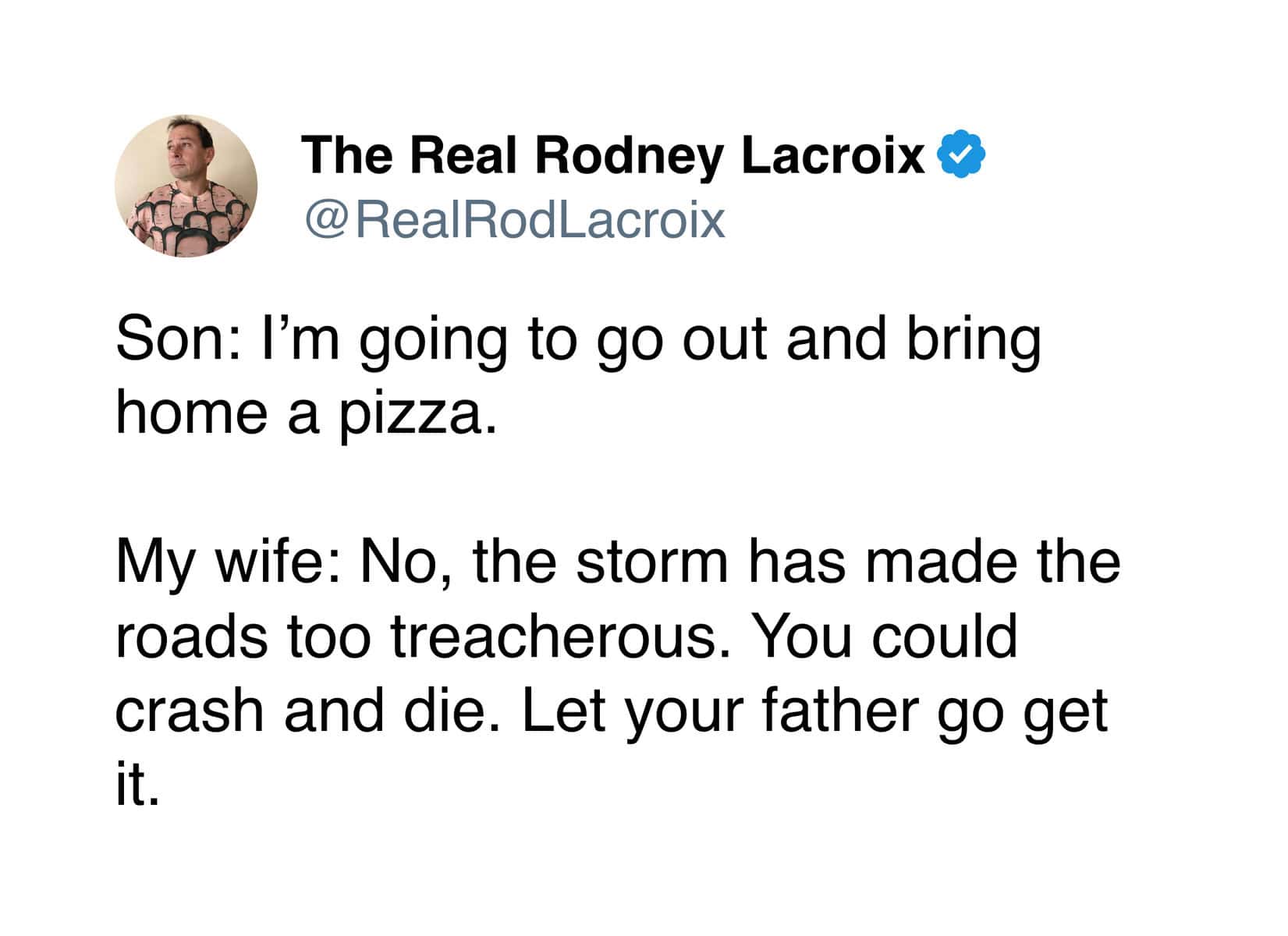 So whenever I see someone still using the platform for what it was meant for, which is making jokes about everyday life, it feels like a small victory. That’s why I love Rodney Lacroix’s dad tweets.