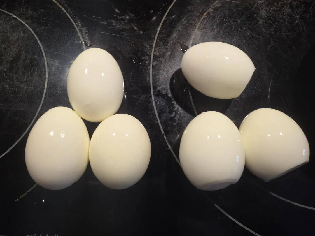 24. “Store bought eggs (left) are fully round. Farm bought eggs (right) have flat bottoms. All cooked together.”
