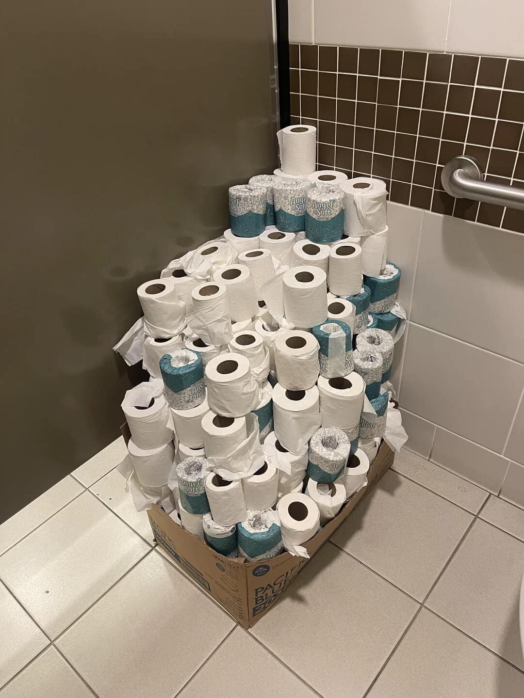 31. “My work has an ever-growing mountain of partially used toilet paper rolls in the bathroom.”