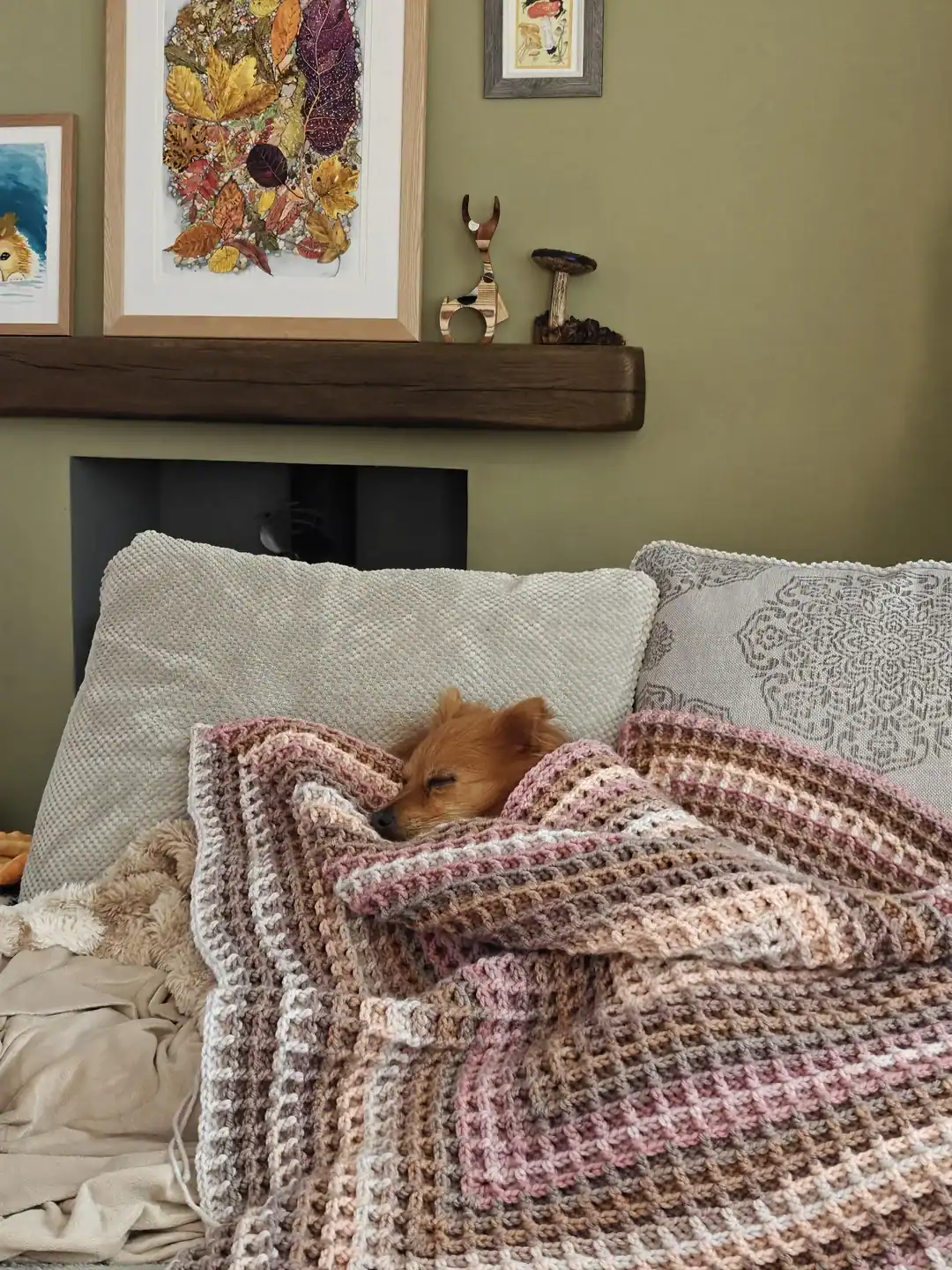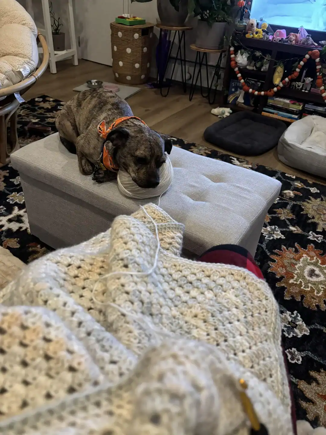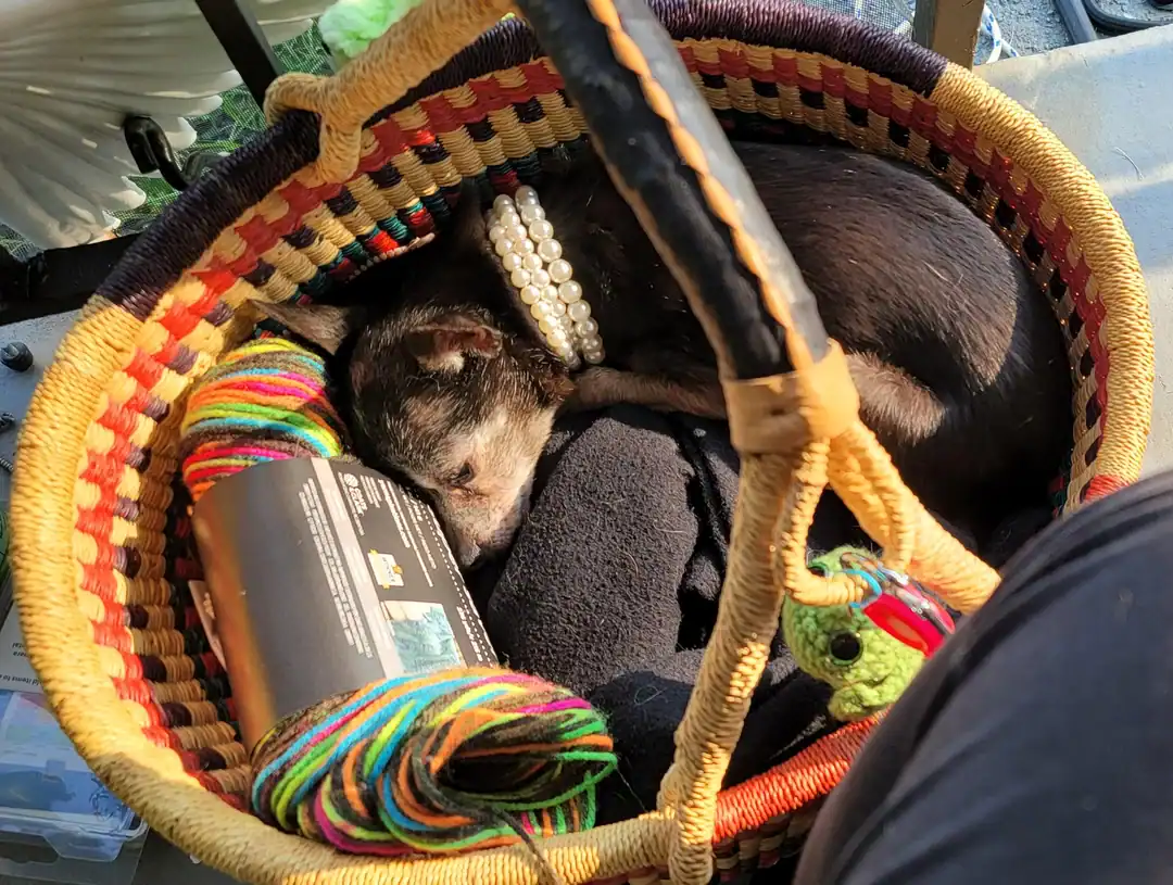 Dogs sleeping on half-finished projects like they’re custom beds. Dogs wearing tiny sweaters that someone spent hours making. Dogs sitting in baskets of yarn, looking completely unbothered.