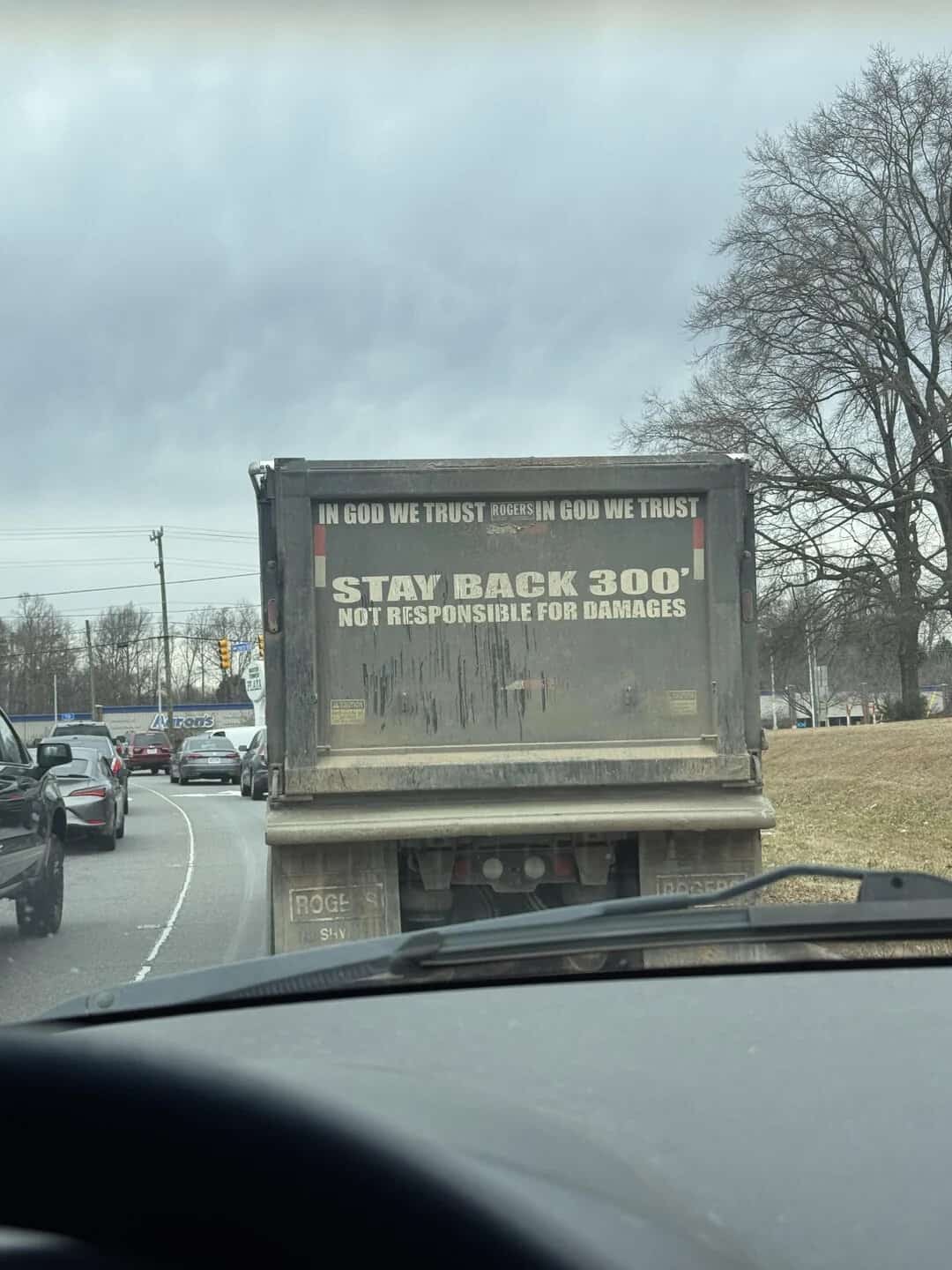 28. “This Trash Truck that says to leave an American Football Field distance between cars”