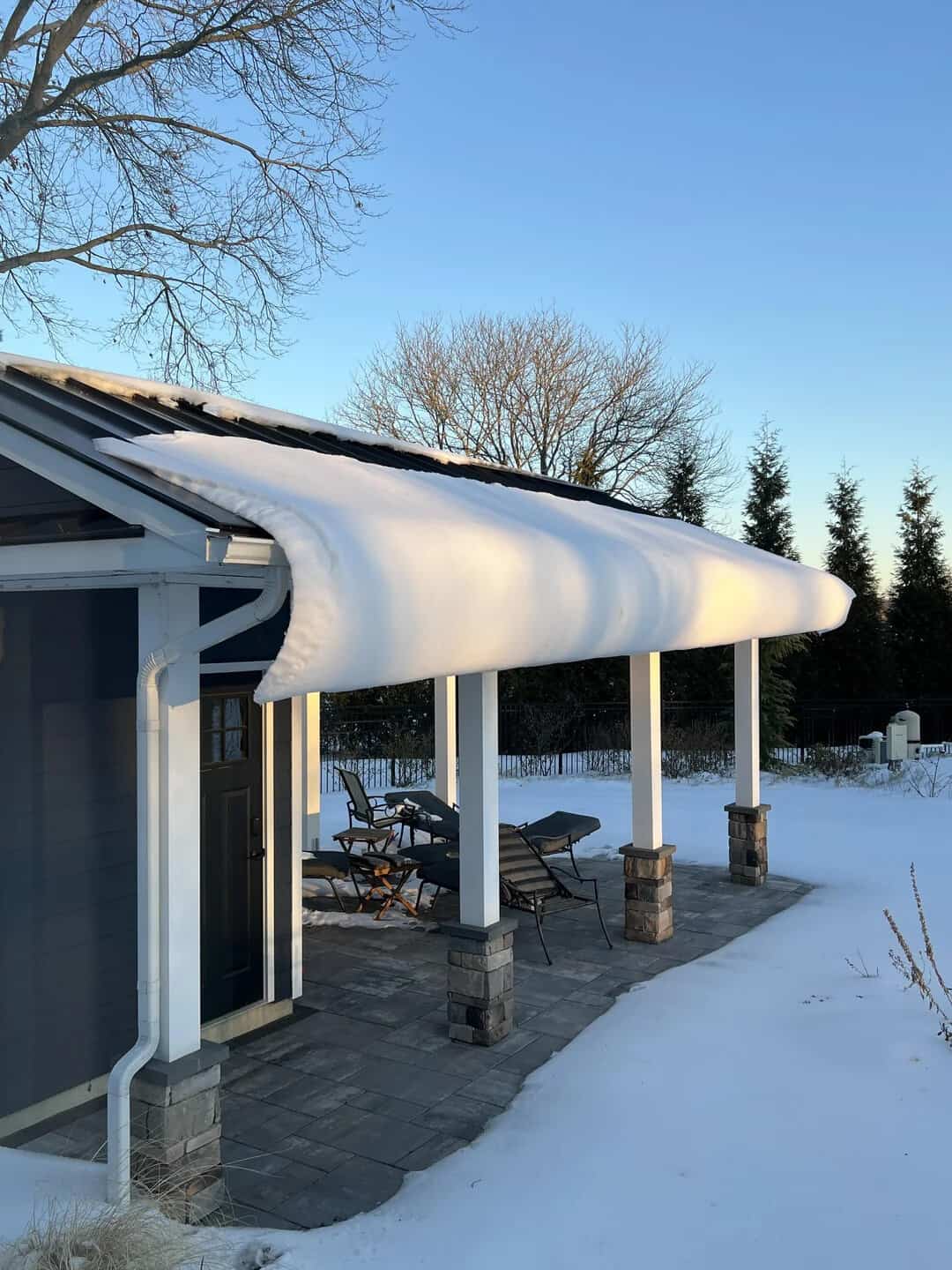 7. “Snow partially slid off pool house roof then froze again”