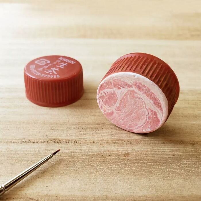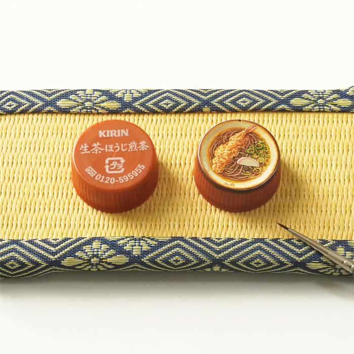 The precision required to paint realistic food this small is wild, and Nishikura nails it every time. Bottle caps become art, and it actually works.