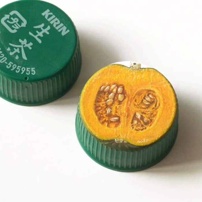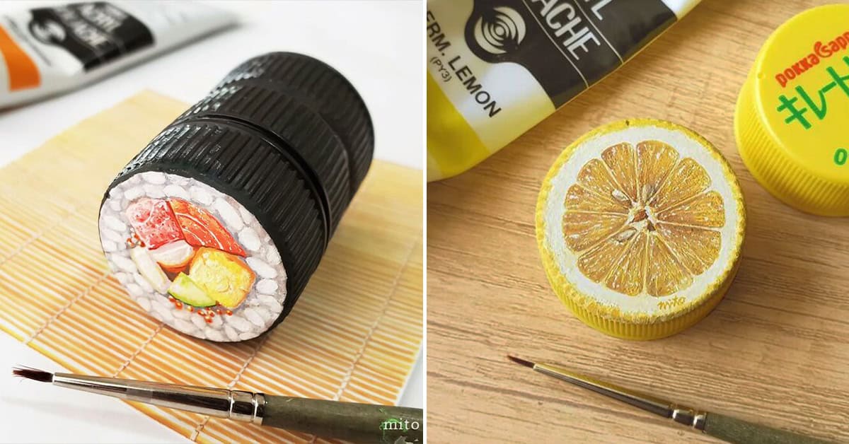 Plastic bottle caps are usually trash, but this talented artist, Mito Nishikura, turns them into miniature food paintings. Tiny pizzas, citrus fruits, miniature sushi. All painted on bottle caps with impressive detail.