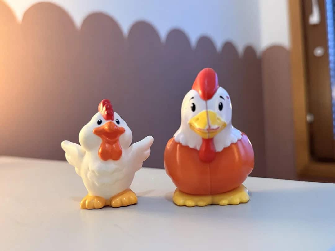 “1997 chicken figure on the left, 2018 version on the right. The 1997 version was made in Thailand, 2018 one made in China.