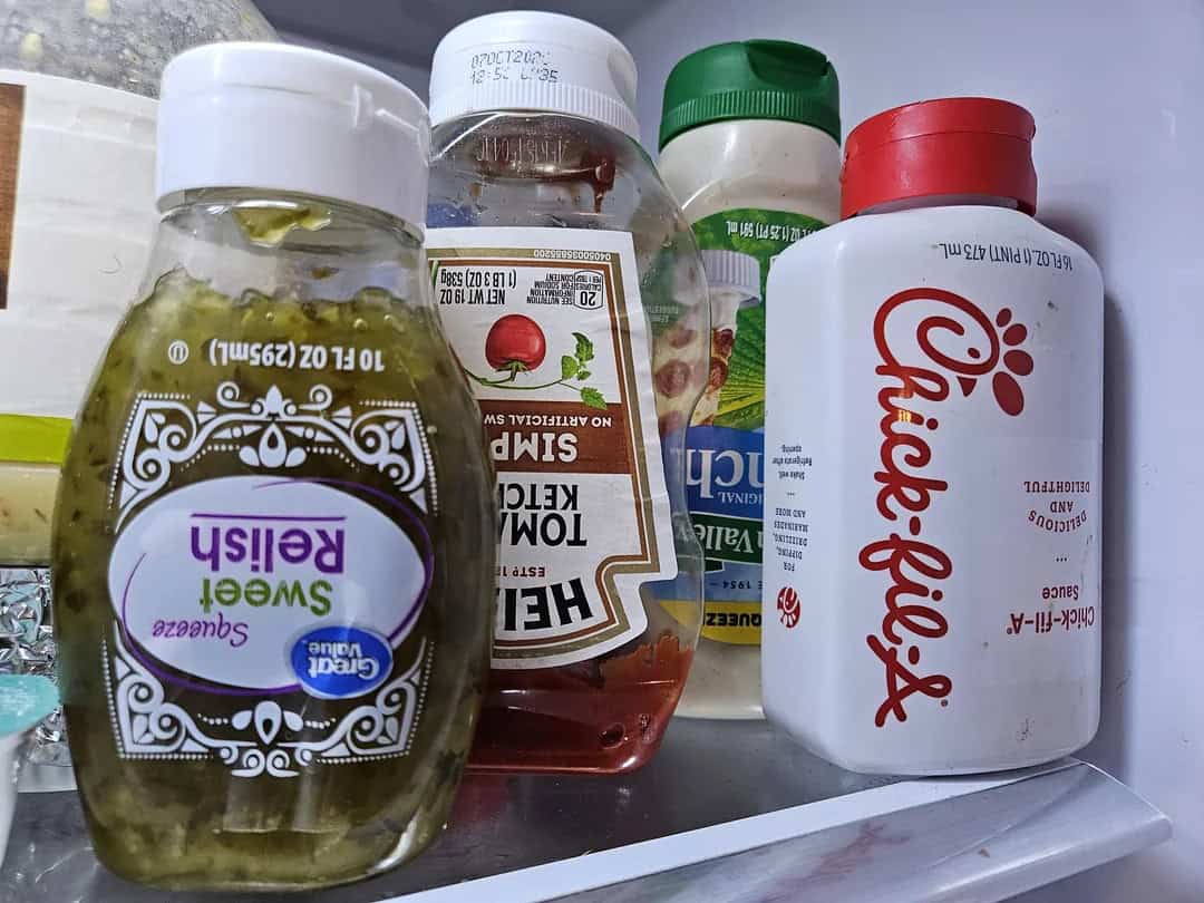 23. “The way my husband stores ‘wide top’ condiments in our fridge”