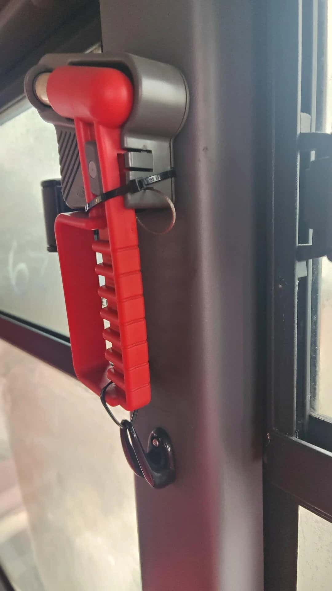 24. “Emergency glass breaker in bus secured with 2 zip-ties”