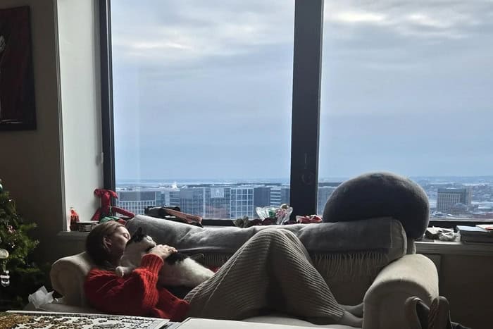 13. “My sister and her cat on Christmas morning.”