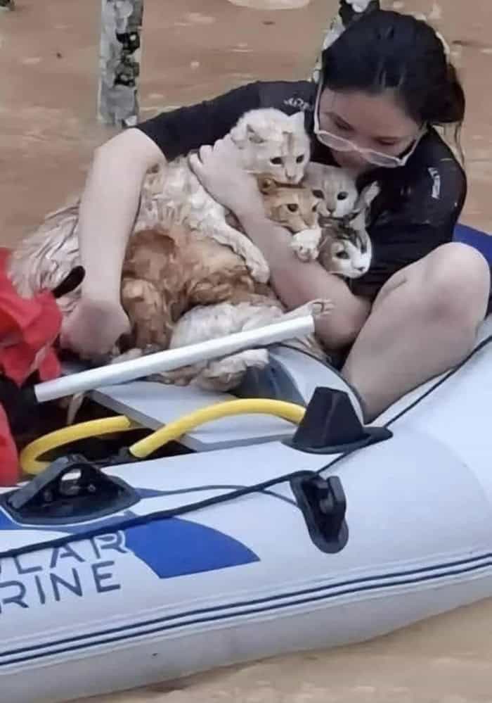 27. “Woman saving her cats from a flood in the Philippines”