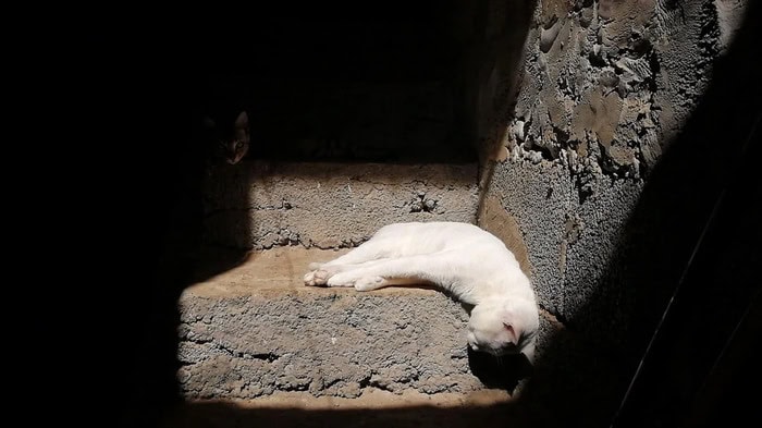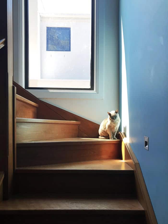 24. “My white cat sleeping on the stairs, the other looking at me in the shadows”