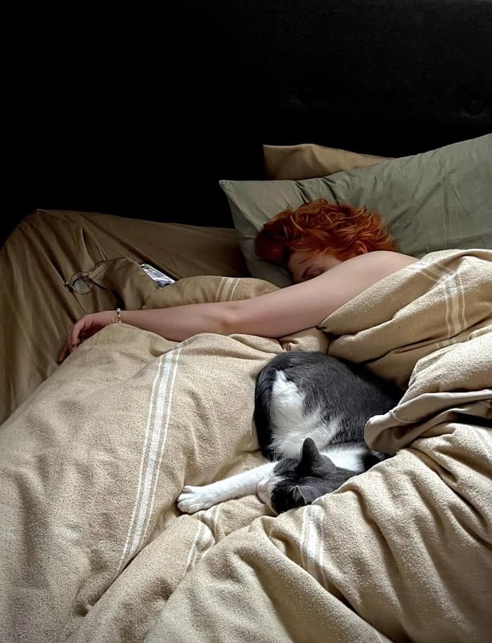 28. “Wild-Haired Woman Napping with Cat”