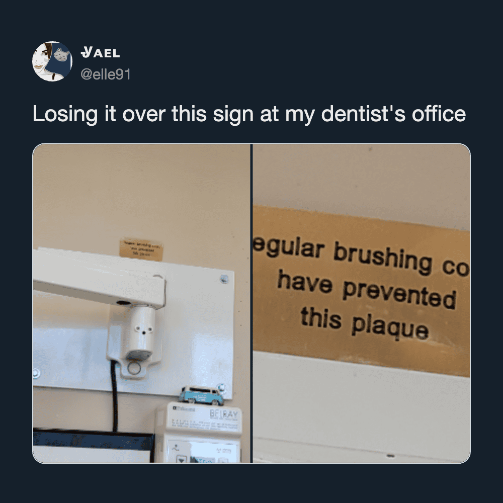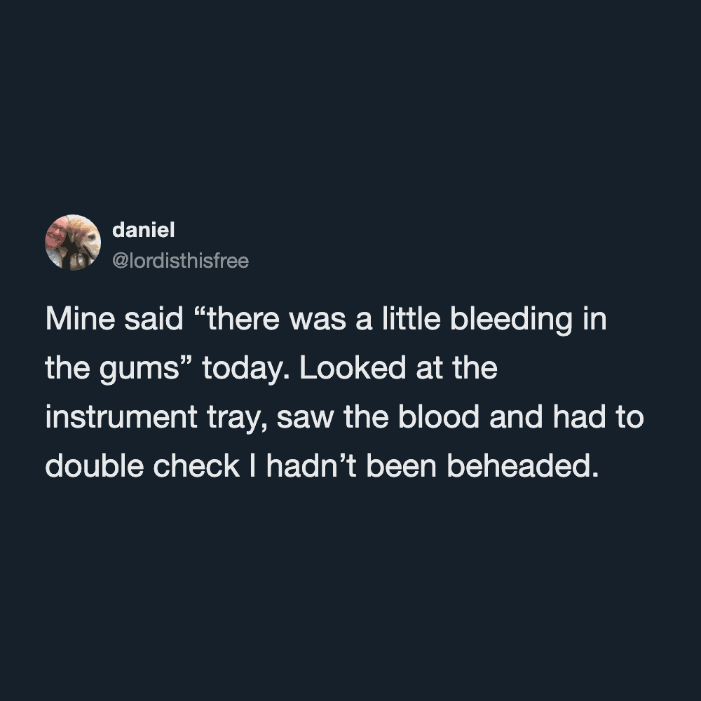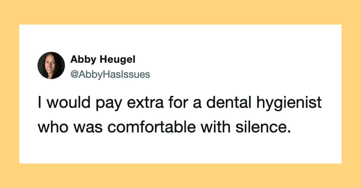 I’m due for a cleaning myself and I’m dreading it. My strategy is avoidance until guilt kicks in. These funny tweets about the whole dentist experience make me feel less alone in a good way, which is oddly comforting before dental torture.