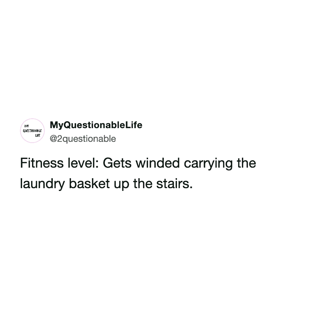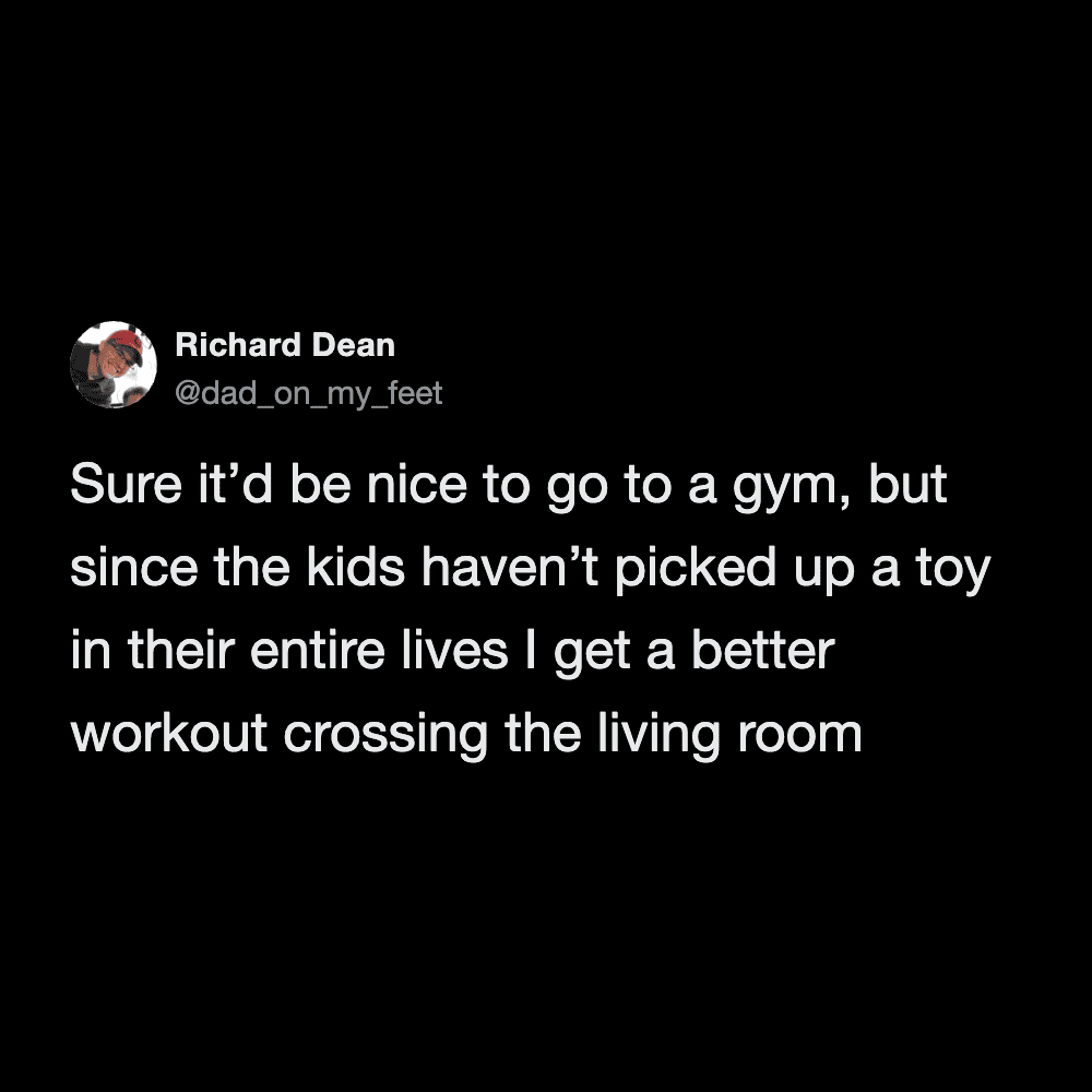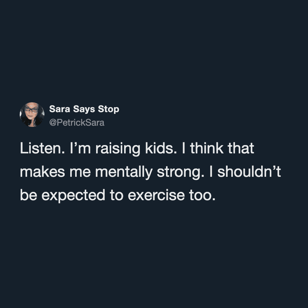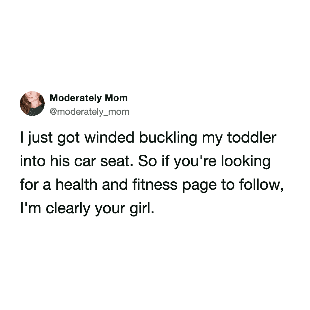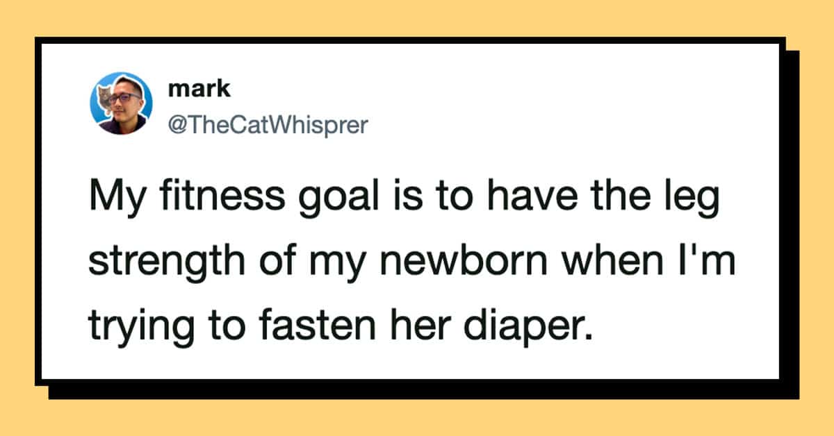 These funny parenting tweets are about how fitness standards change after having kids, and they’re hilarious. The goals shift from “run a 5K” to “survive carrying a toddler up the stairs without throwing out your back.”