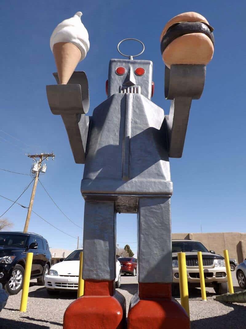 9. “That is a giant robot statue holding a burger and an ice cream cone! It is a famous roadside attraction located in Santa Rosa, New Mexico.”