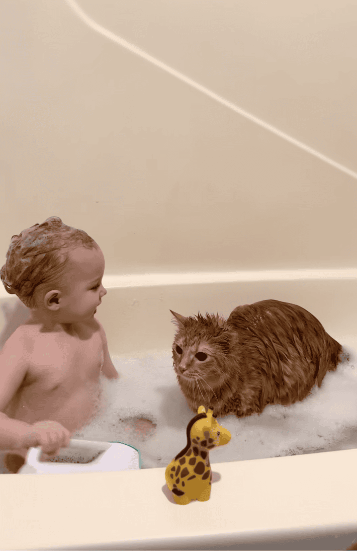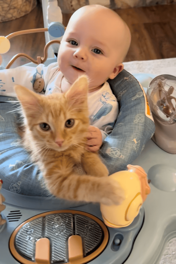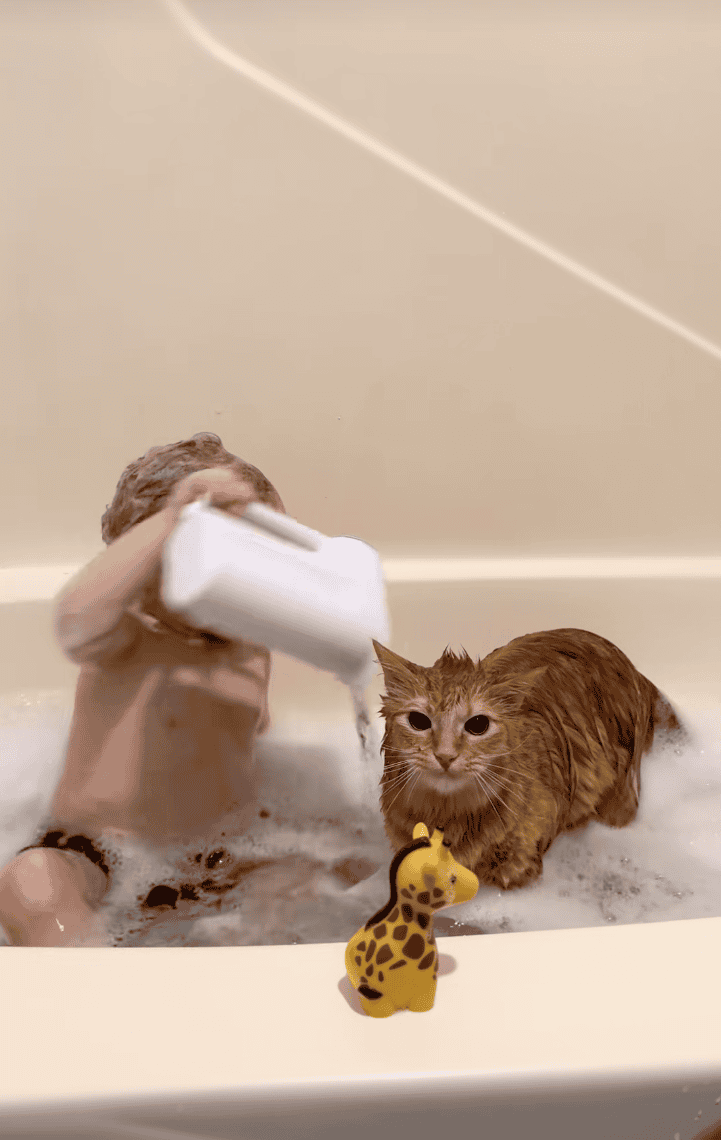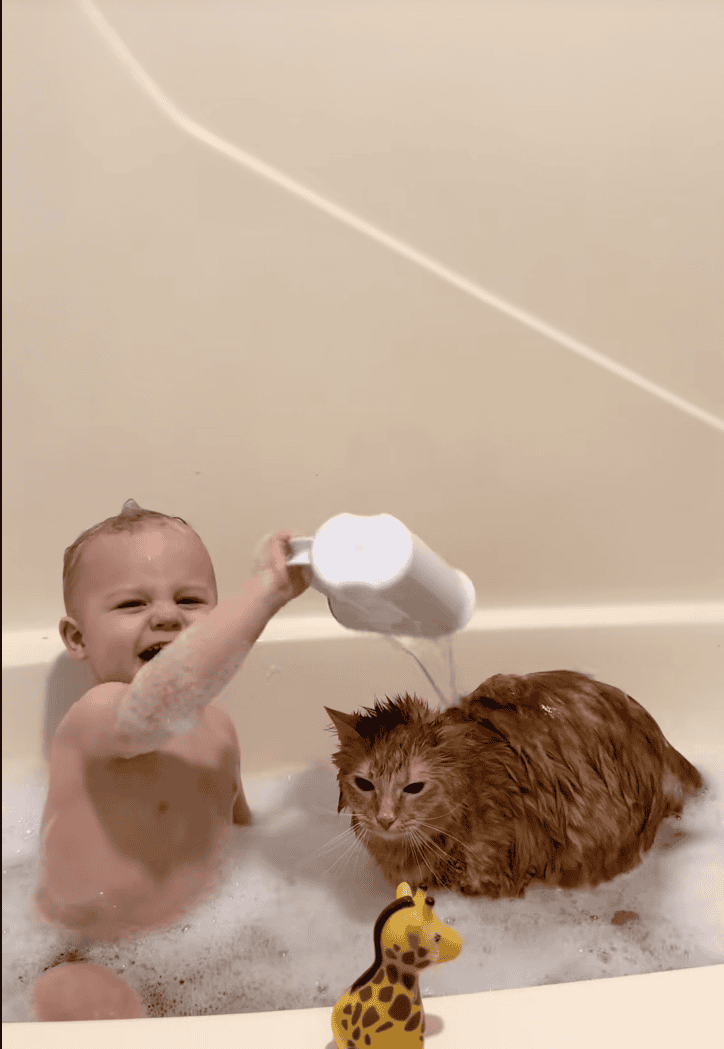 Most cats would’ve activated full ninja mode the second a baby started splashing, grabbing, or testing personal boundaries. Not Johnny. He sits there like a soggy little therapist, tolerating the chaos with the quiet dignity of someone who knows resistance is futile.