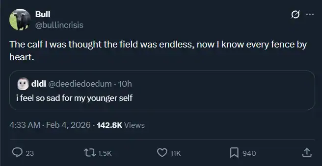 After a while you start to appreciate the rare tweet that actually feels new—like someone just unlocked a sentence that has never existed in human history before.